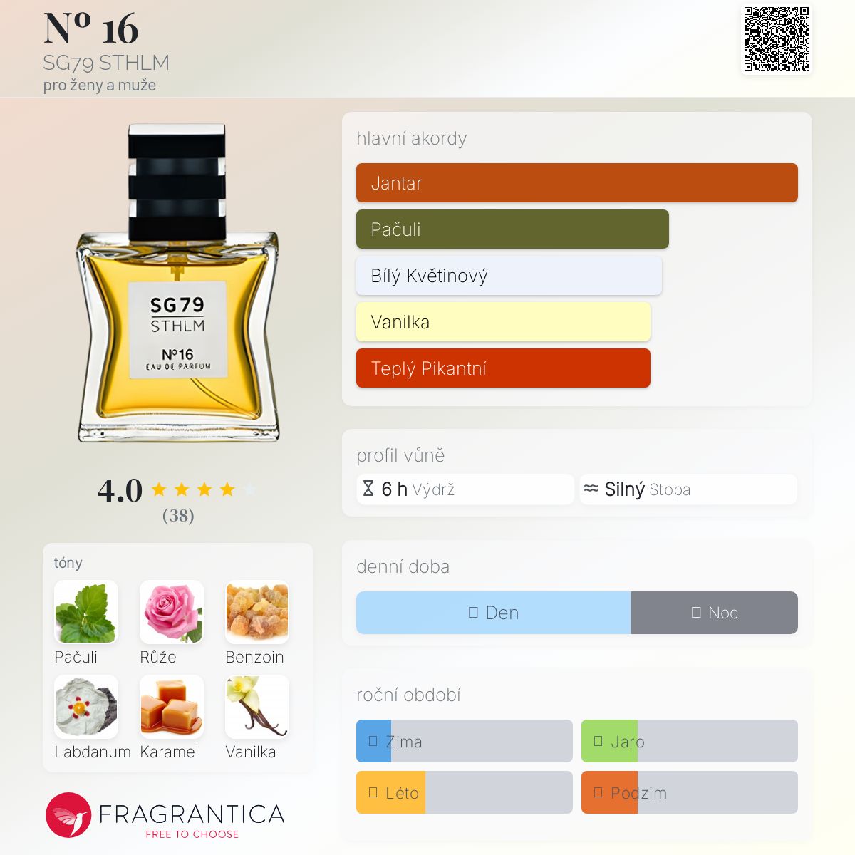 Nº 16 podle SG79 STHLM je Chypre Floral vůně pro ženy a muže. Nº 16 byl/a uveden/a v roce 2016. Vrchní tóny jsou Benzoin, Labdanum a Bergamot; střední tóny jsouRůže, Ovocné tóny, Bílé květy, Jasmín a Pomerančový květ ; základní tóny jsou Pačuli, Karamel, Vanilka a Jantar (ambra).