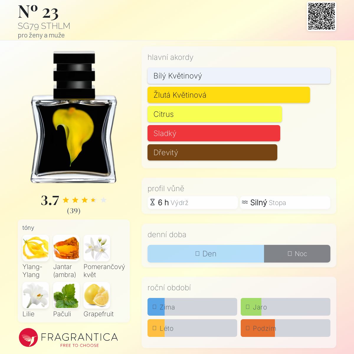 Nº 23 podle SG79 STHLM je Orientální Floral vůně pro ženy a muže. Nº 23 byl/a uveden/a v roce 2017. Vrchní tóny jsou Ylang-Ylang, Grapefruit a Petitgrain; střední tóny jsouLilie, Jasmín a Růže ; základní tóny jsou Jantar (ambra), Pomerančový květ a Pačuli.