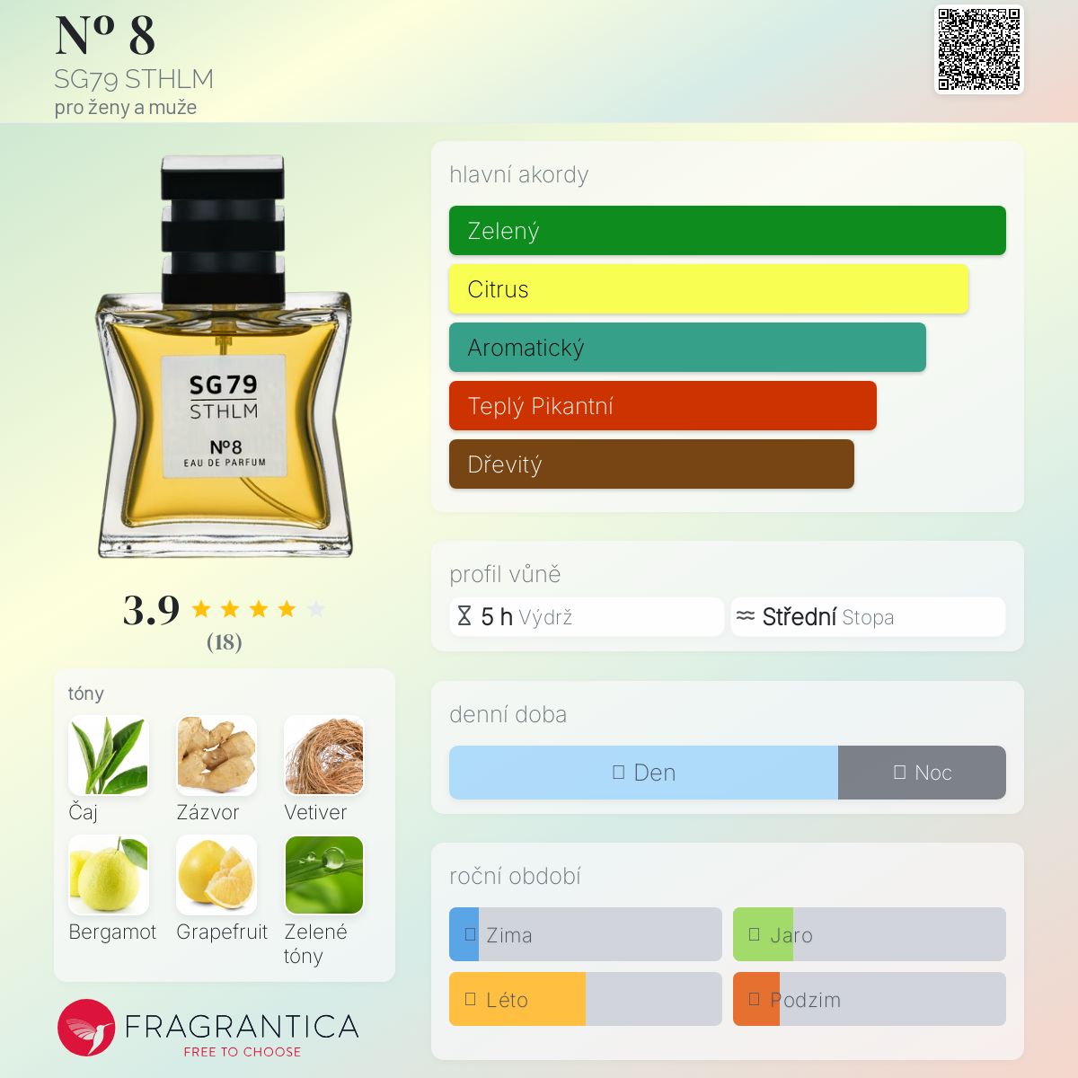 Nº 8 podle SG79 STHLM je Floral Green vůně pro ženy a muže. Nº 8 byl/a uveden/a v roce 2022. Vrchní tóny jsou Bergamot, Grapefruit, Šalvěj, Sporýš a Kardamom; střední tóny jsouZelený čaj, Zázvor, Zelené tóny, Růže a Hruška ; základní tóny jsou Vetiver, Pižmo a Cedr.