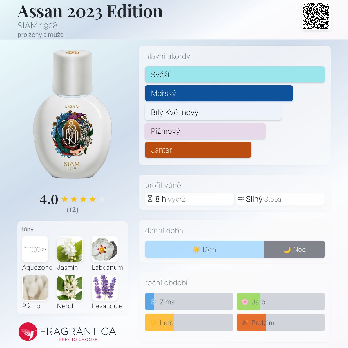 Assan 2023 Edition podle SIAM 1928 je vůně pro ženy a muže. Assan 2023 Edition byl/a uveden/a v roce 2023. "Nosem" za touto vůní je Nutt Wesshasartar. Vrchní tóny jsou Aquozone, Neroli a Levandule; střední tóny jsouJasmín a Labdanum ; základní tóny jsou Pižmo a Dubový mech.