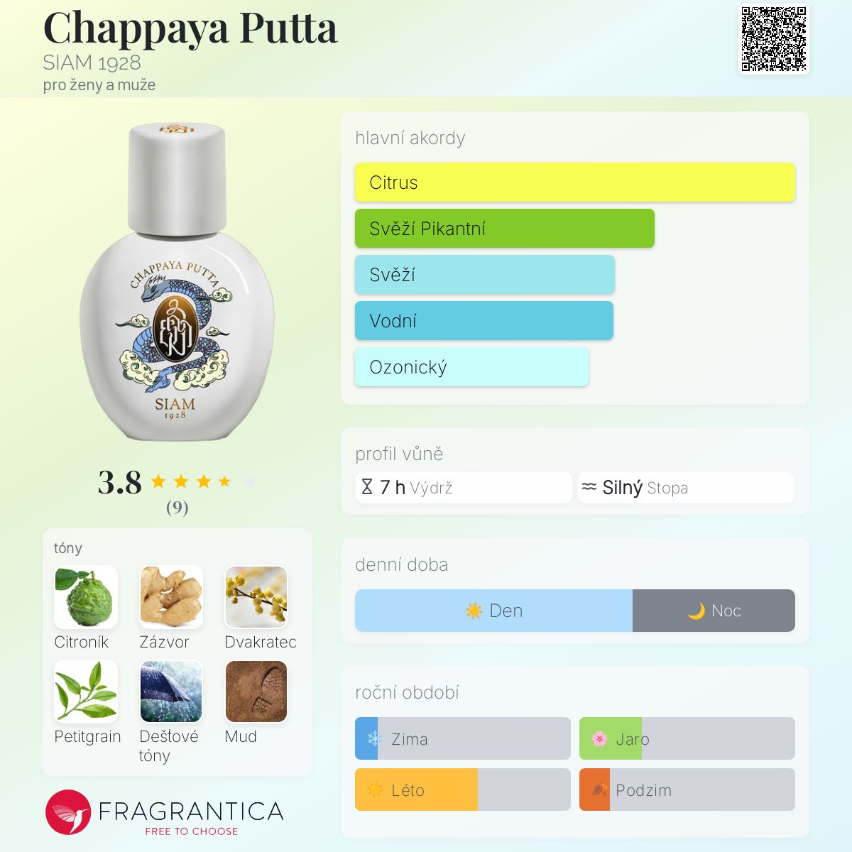 Chappaya Putta podle SIAM 1928 je Citrus Aromatic vůně pro ženy a muže. Chappaya Putta byl/a uveden/a v roce 2023. "Nosem" za touto vůní je Nutt Wesshasartar. Vrchní tóny jsou Citroník, Dvakratec a Petitgrain; střední tóny jsouZázvor a Dešťové tóny ; základní tóny jsou Bahno, Pačuli a Pižmo.