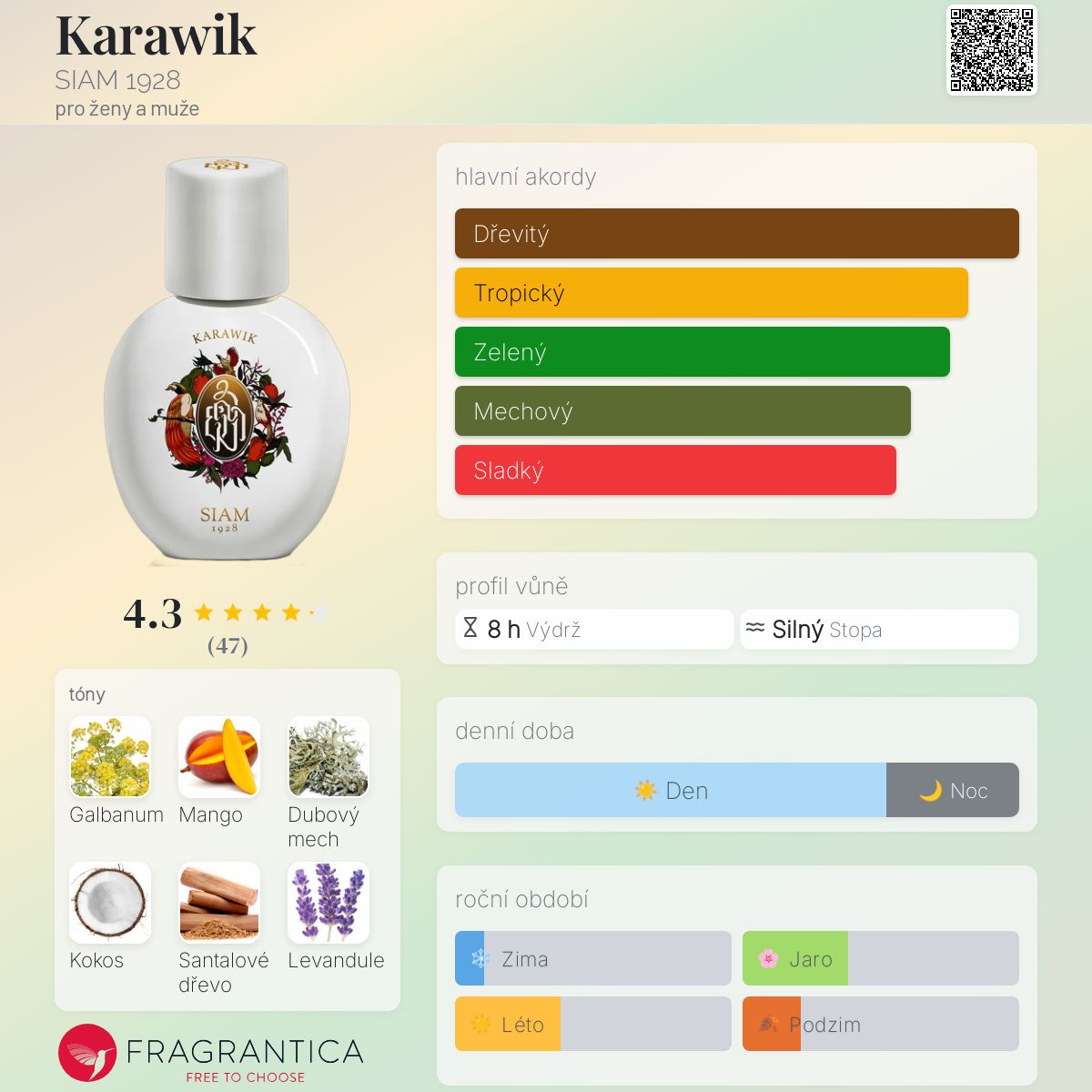 Karawik podle SIAM 1928 je Woody Aromatic vůně pro ženy a muže. Karawik byl/a uveden/a v roce 2023. "Nosem" za touto vůní je Nutt Wesshasartar. Vrchní tóny jsou Galbanum a Levandule; střední tóny jsouMango, Kokos a Magnólie ; základní tóny jsou Dubový mech, Santalové dřevo a Cedr.