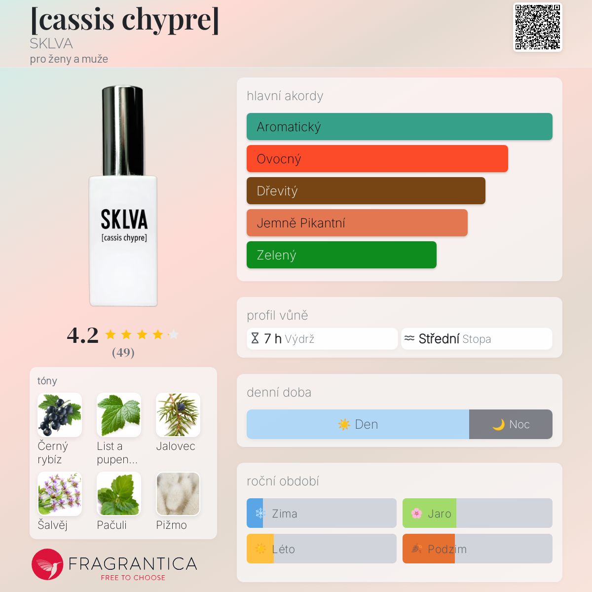 [cassis chypre] podle SKLVA je Chypre Fruity vůně pro ženy a muže. [cassis chypre] byl/a uveden/a v roce 2020. "Nosem" za touto vůní je Anna Sokolova. Vrchní tóny jsou Kasie, Kardamom, Elemi, Aldehydy a Muškátový oříšek; střední tóny jsouČerný rybíz, Jalovec, Šalvěj a Kadidlo ; základní tóny jsou Pačuli, Pižmo, Vetiver, Dubový mech a Jantar (ambra).