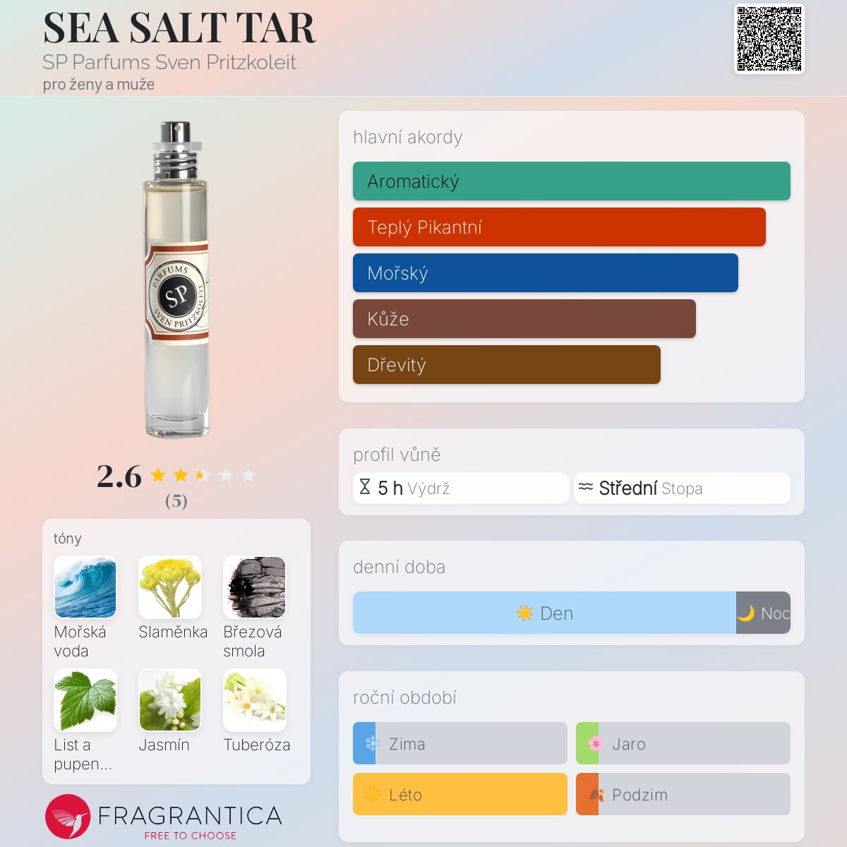 SEA SALT TAR podle SP Parfums Sven Pritzkoleit je Floral Woody Musk vůně pro ženy a muže. SEA SALT TAR byl/a uveden/a v roce 2019. "Nosem" za touto vůní je Sven Pritzkoleit.