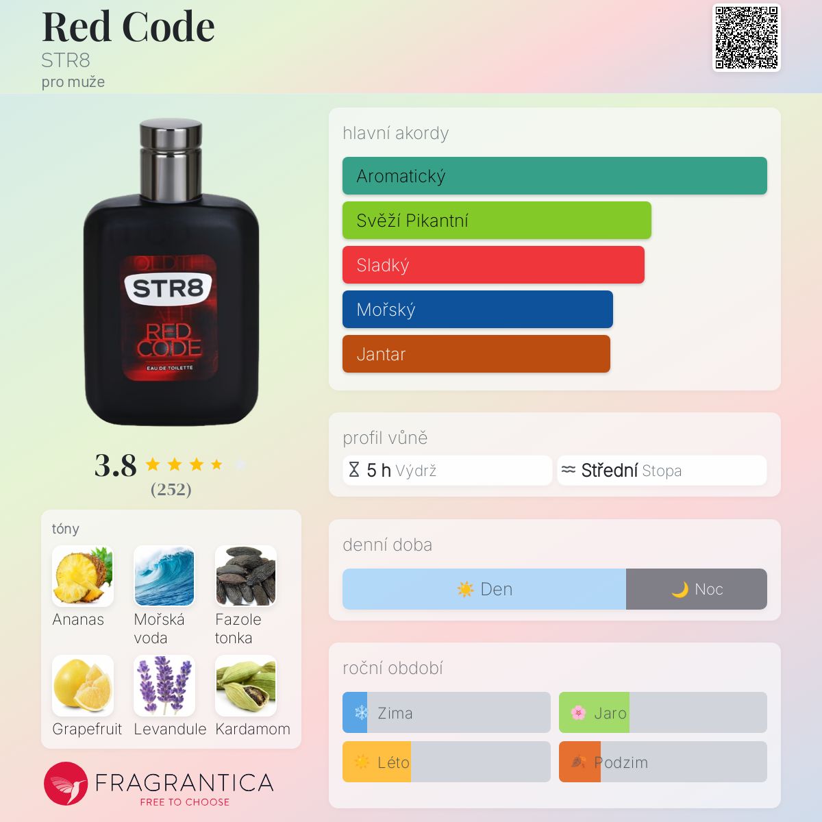 Red Code podle STR8 je vůně pro muže. Red Code byl/a uveden/a v roce 2015. Vrchní tóny jsou Ananas, Mořské tóny, Grapefruit a Kardamom; střední tóny jsouLevandule, Jasmín, Pelargónie a Tymián ; základní tóny jsou Fazole tonka, Jantar (ambra) a Jedle.