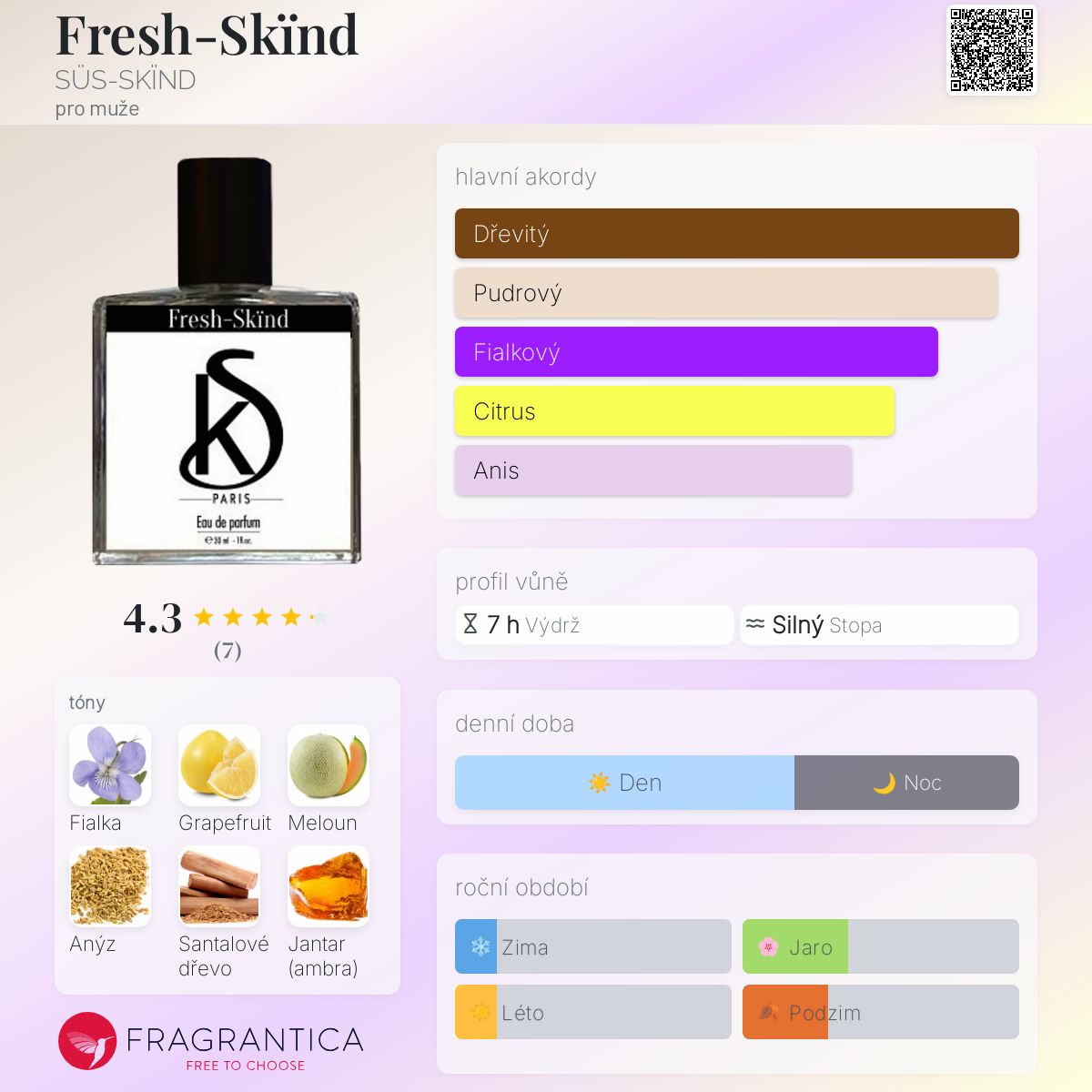 Fresh-Skïnd podle SÜS-SKÏND je vůně pro muže. Fresh-Skïnd byl/a uveden/a v roce 2016. Vrchní tóny jsou Grapefruit a Anýz; střední tóny jsouFialka a Meloun ; základní tóny jsou Santalové dřevo, Jantar (ambra) a Cedr.