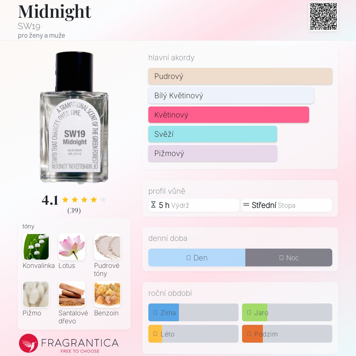 Midnight podle SW19 je Floral Woody Musk vůně pro ženy a muže. "Nosem" za touto vůní je Marianne Nawrocki Sabatier. Vrchní tóny jsou Konvalinka a Bílý lotos; střední tóny jsouPudrové tóny a Bílé pižmo ; základní tóny jsou Pižmo, Santalové dřevo a Benzoin.