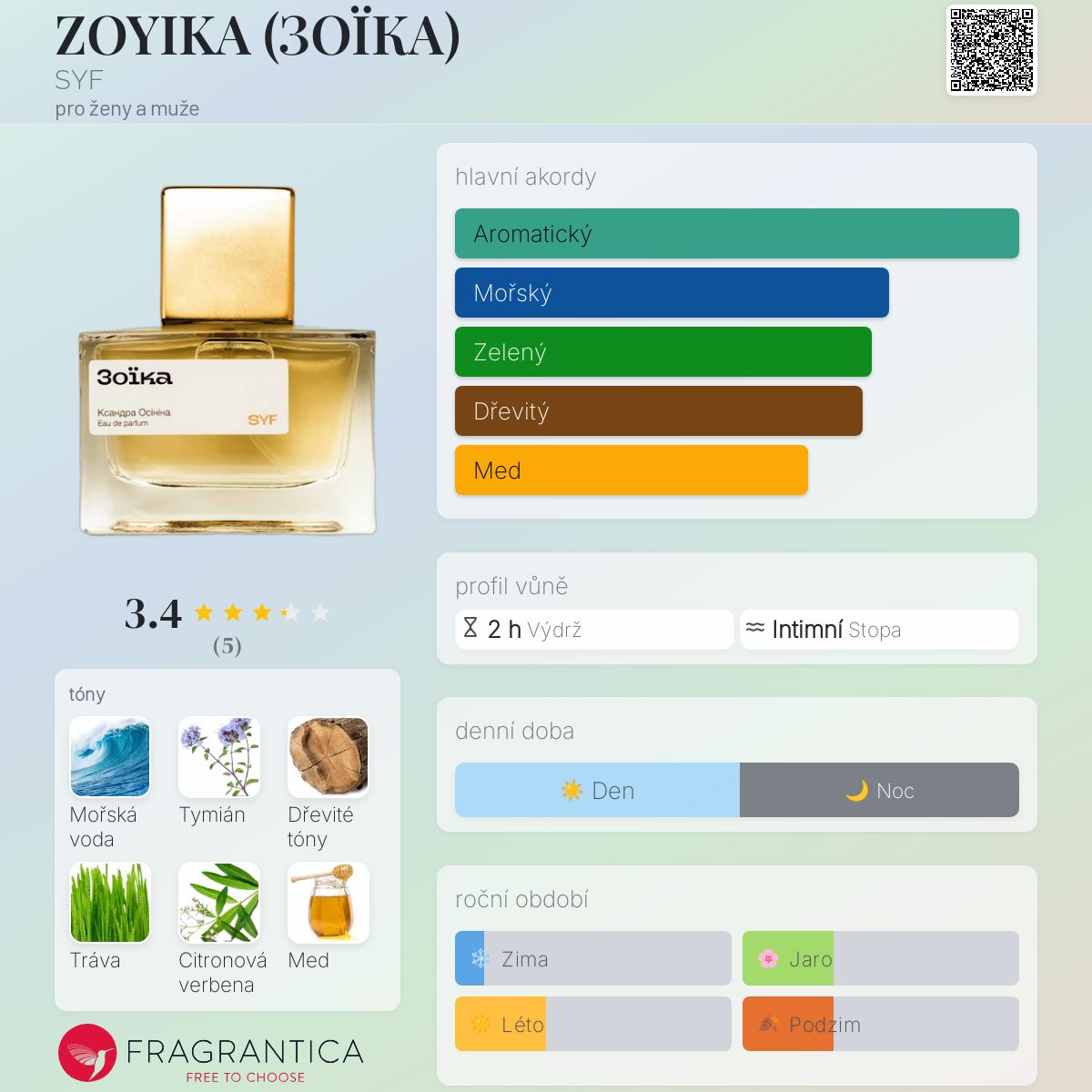 ZOYIKA (ЗОЇКА) podle SYF je Aromatic Green vůně pro ženy a muže. Toto je nová vůně. ZOYIKA (ЗОЇКА) byl/a uveden/a v roce 2025. "Nosem" za touto vůní je Ksandra Osinina.
