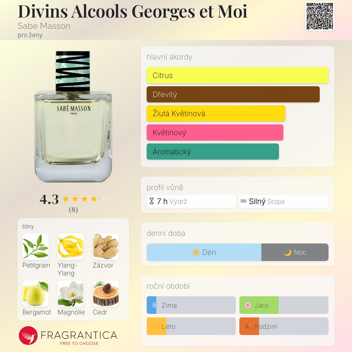 Divins Alcools Georges et Moi podle Sabe Masson je Floral Woody Musk vůně pro ženy. Divins Alcools Georges et Moi byl/a uveden/a v roce 2015. Vrchní tóny jsou Citronový list a Bergamot; střední tóny jsouYlang-Ylang, Zázvor, Magnólie a Růže ; základní tóny jsou Cedr a Vetiver.