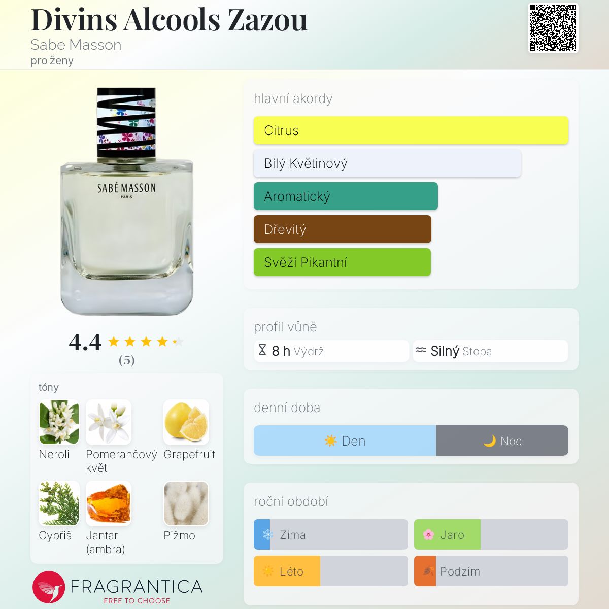 Divins Alcools Zazou podle Sabe Masson je Floral vůně pro ženy. Divins Alcools Zazou byl/a uveden/a v roce 2015. Vrchní tóny jsou Grapefruit a Citrón a Citrón; střední tóny jsouNeroli, Pomerančový květ, Cypřiš a Zázvor ; základní tóny jsou Jantar (ambra), Pižmo a Cedr.
