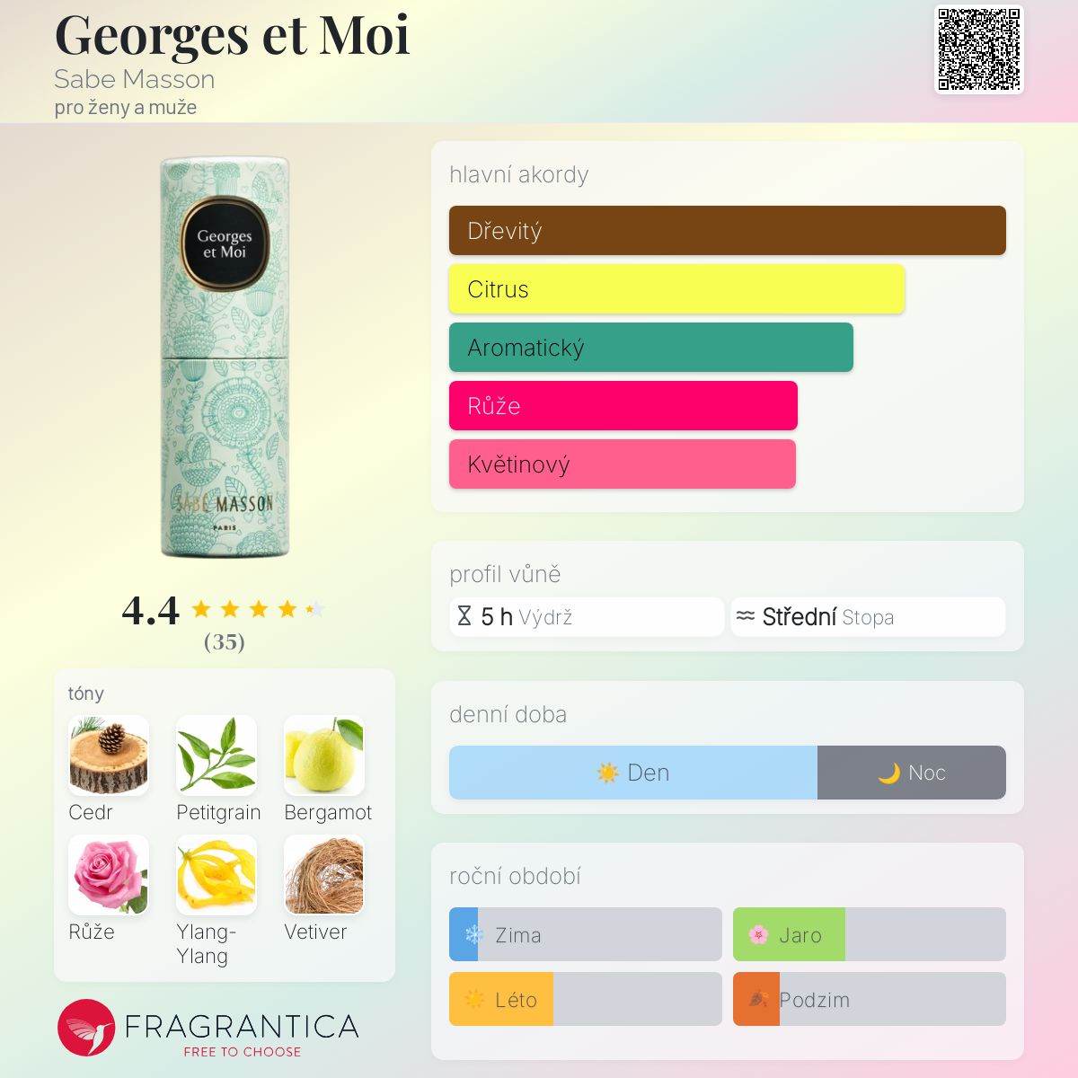 Georges et Moi podle Sabe Masson je Floral Woody Musk vůně pro ženy a muže. Georges et Moi byl/a uveden/a v roce 2015. Vrchní tóny jsou Citronový list a Bergamot; střední tóny jsouRůže, Ylang-Ylang, Zázvor a Magnólie ; základní tóny jsou Cedr a Vetiver.