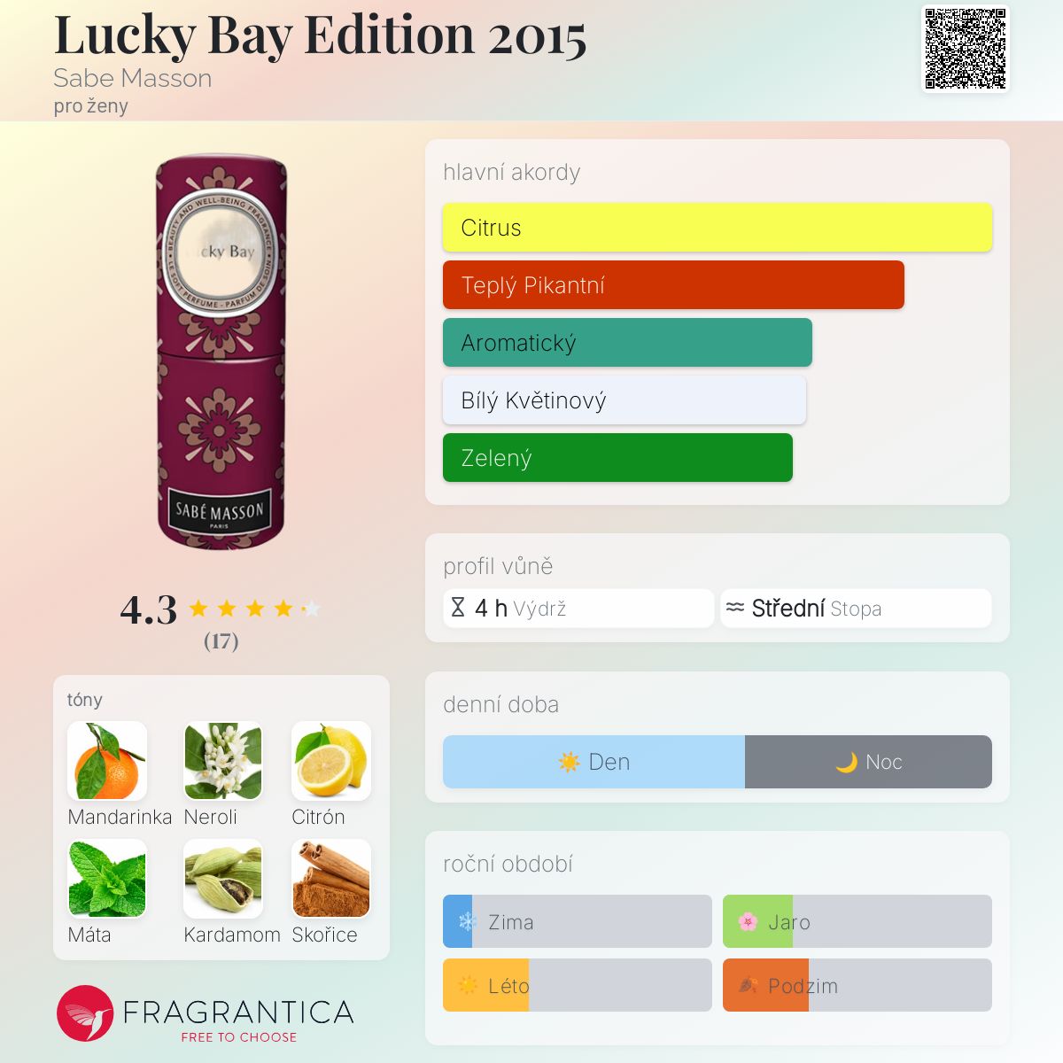 Lucky Bay Edition 2015 podle Sabe Masson je Woody Chypre vůně pro ženy. Lucky Bay Edition 2015 byl/a uveden/a v roce 2015. Vrchní tóny jsou Mandarinka, Neroli, Citrón, Máta, Kardamom a Skořice; střední tóny jsouRůže, Petitgrain, Pomerančový květ a Hřebíček ; základní tóny jsou Pačuli, Santalové dřevo a Jantar (ambra).
