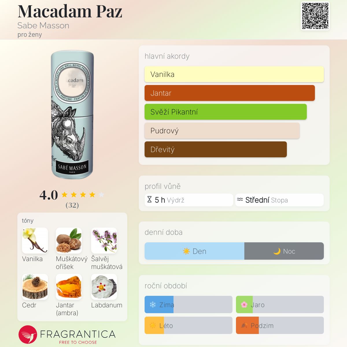 Macadam Paz podle Sabe Masson je Orientální Woody vůně pro ženy. Macadam Paz byl/a uveden/a v roce 2015. Vrchní tóny jsou Neroli a Bergamot; střední tóny jsouMuškátový oříšek, Šalvěj muškátová a Tuberóza ; základní tóny jsou Vanilka, Cedr, Jantar (ambra), Labdanum a Pižmo.