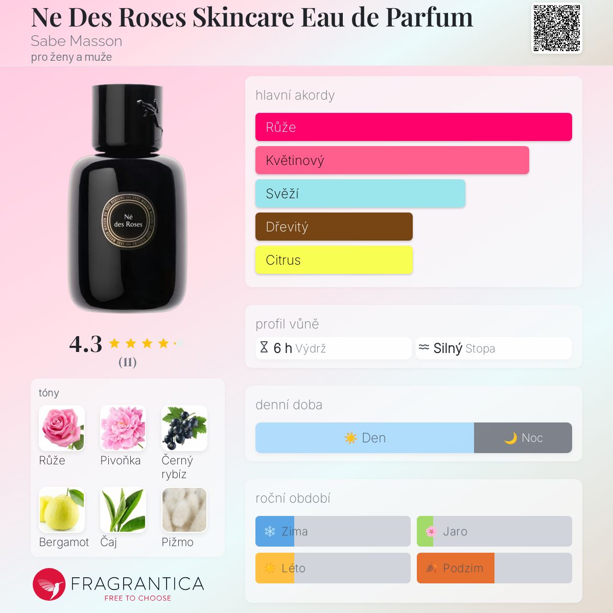 Ne Des Roses Skincare Eau de Parfum podle Sabe Masson je Floral vůně pro ženy a muže. Ne Des Roses Skincare Eau de Parfum byl/a uveden/a v roce 2017. "Nosem" za touto vůní je Serge de Oliveira. Vrchní tóny jsou Pivoňka, Černý rybíz a Bergamot; střední tóny jsouRůže a Zelený čaj ; základní tóny jsou Pižmo, Pačuli a Mech.