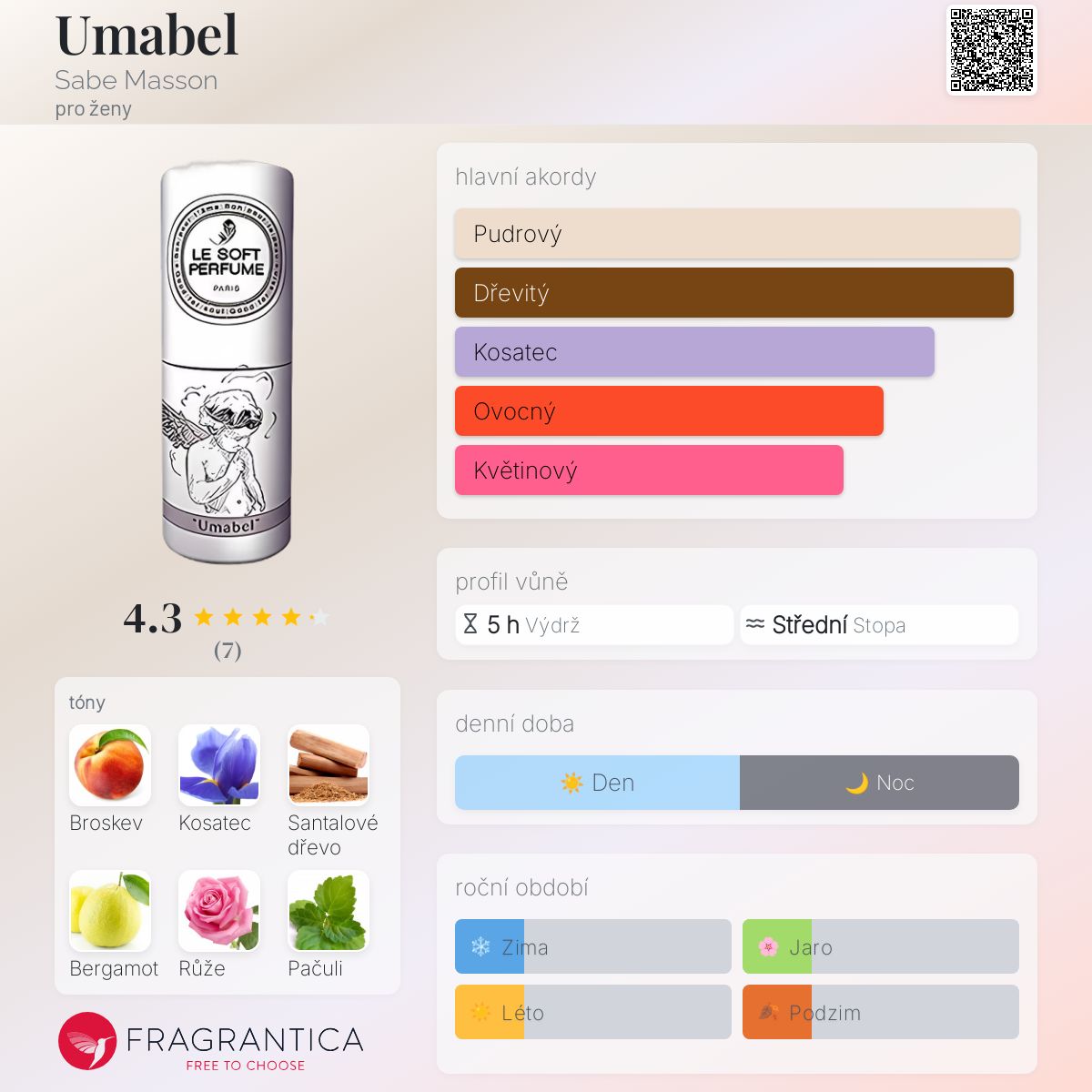 Umabel podle Sabe Masson je Floral Woody Musk vůně pro ženy. Umabel byl/a uveden/a v roce 2015. Vrchní tóny jsou Broskev a Bergamot; střední tóny jsouKosatec, Růže a Frézie ; základní tóny jsou Santalové dřevo, Pačuli, Pižmo a Jantar (ambra).