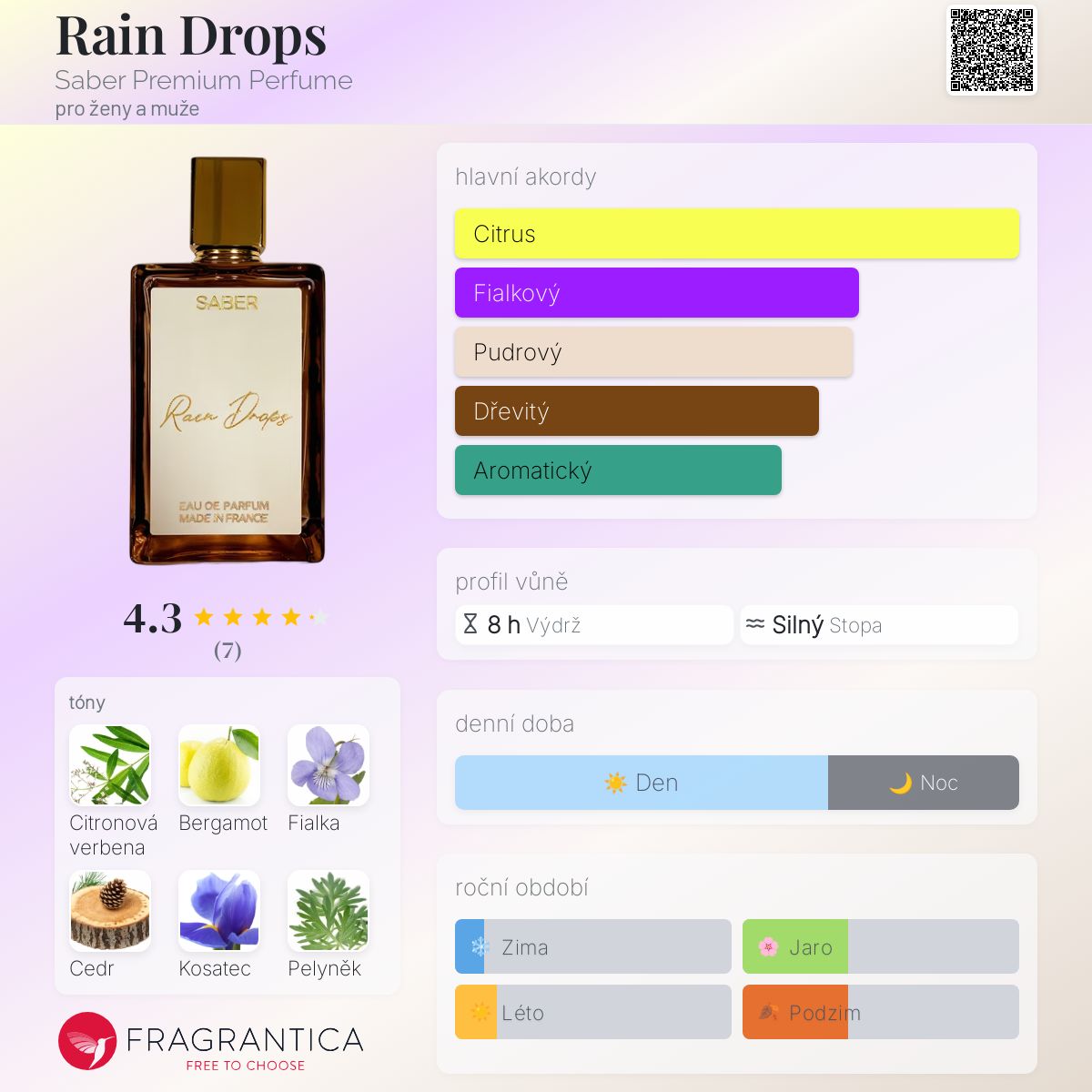 Rain Drops podle Saber Premium Perfume je Citrus Aromatic vůně pro ženy a muže. Toto je nová vůně. Rain Drops byl/a uveden/a v roce 2024. Vrchní tóny jsou Bergamot, Fialka a Pelyněk; střední tóny jsouCitronová verbena a Kosatec ; základní tóny jsou Cedr a Pižmo.