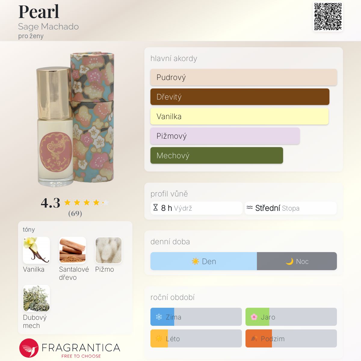 Pearl podle Sage Machado je Woody vůně pro ženy. Vrchní tón je Dubový mech ; střední tón jeSantalové dřevo ; základní tóny jsou Vanilka a Pižmo.