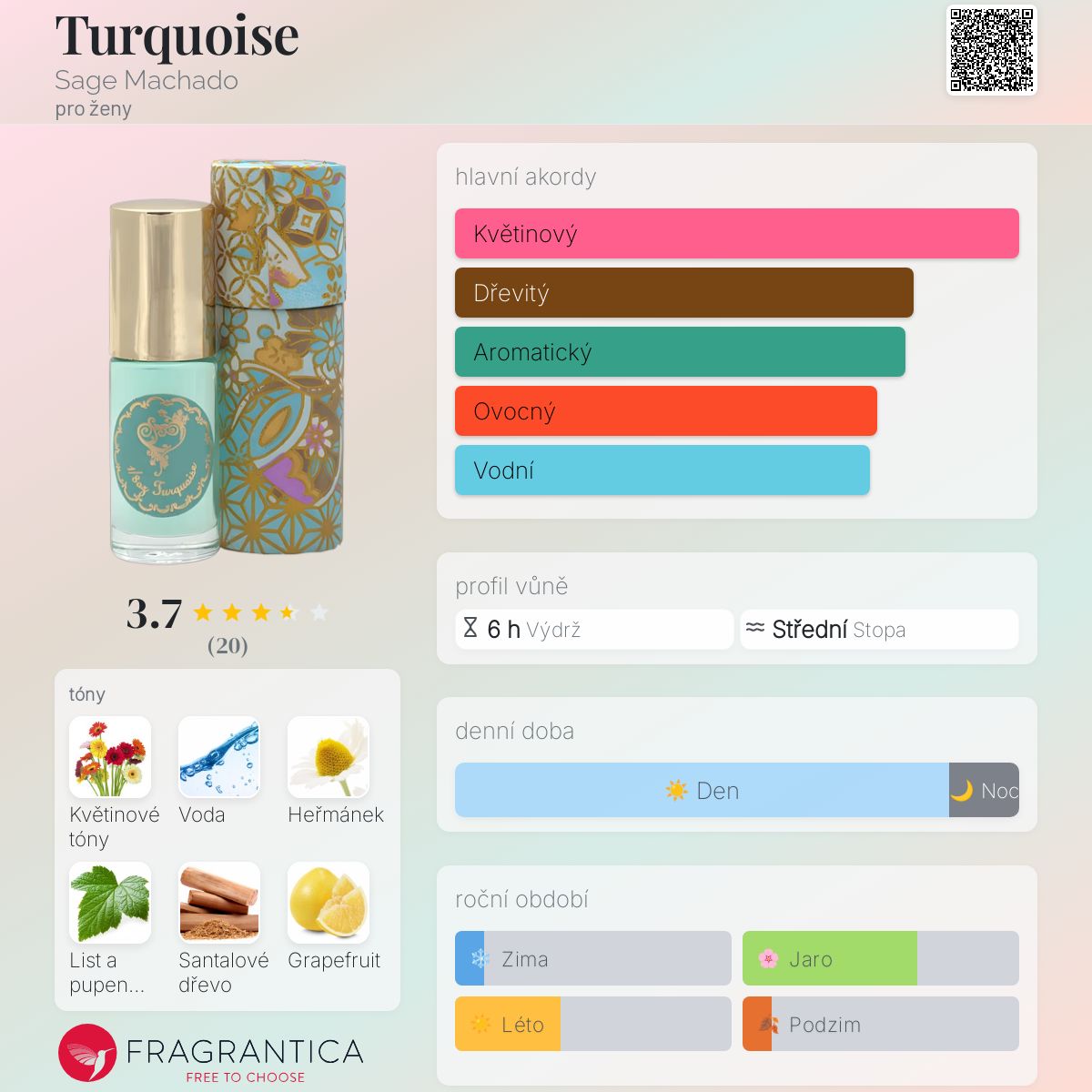 Turquoise podle Sage Machado je Woody Aquatic vůně pro ženy. Vrchní tóny jsou Heřmánek a Černý rybíz, Grapefruit a Černý rybíz; střední tóny jsouKvětinové tóny a Vodní tóny ; základní tóny jsou Santalové dřevo a Pižmo.