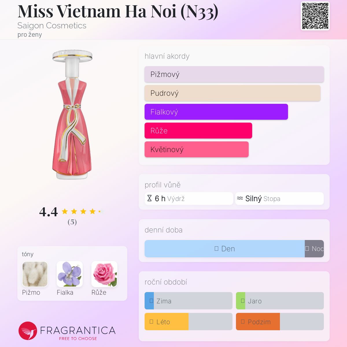 Miss Vietnam Ha Noi (N33) podle Saigon Cosmetics je Floral vůně pro ženy. Miss Vietnam Ha Noi (N33) byl/a uveden/a v roce 2008. Vrchní tóny jsou Fialka a Růže; střední tón jeBílé pižmo ; základní tón je Bílé pižmo.