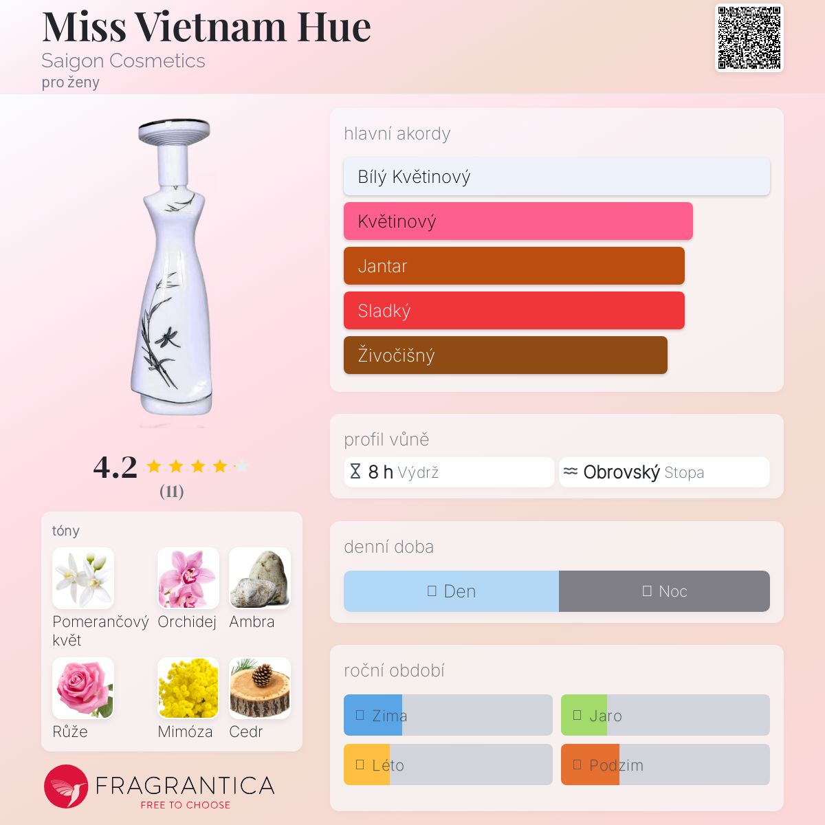 Miss Vietnam Hue podle Saigon Cosmetics je Orientální Floral vůně pro ženy. Vrchní tón je Pomerančový květ ; střední tóny jsouOrchidej, Růže a Mimóza ; základní tóny jsou Ambra a Cedr.