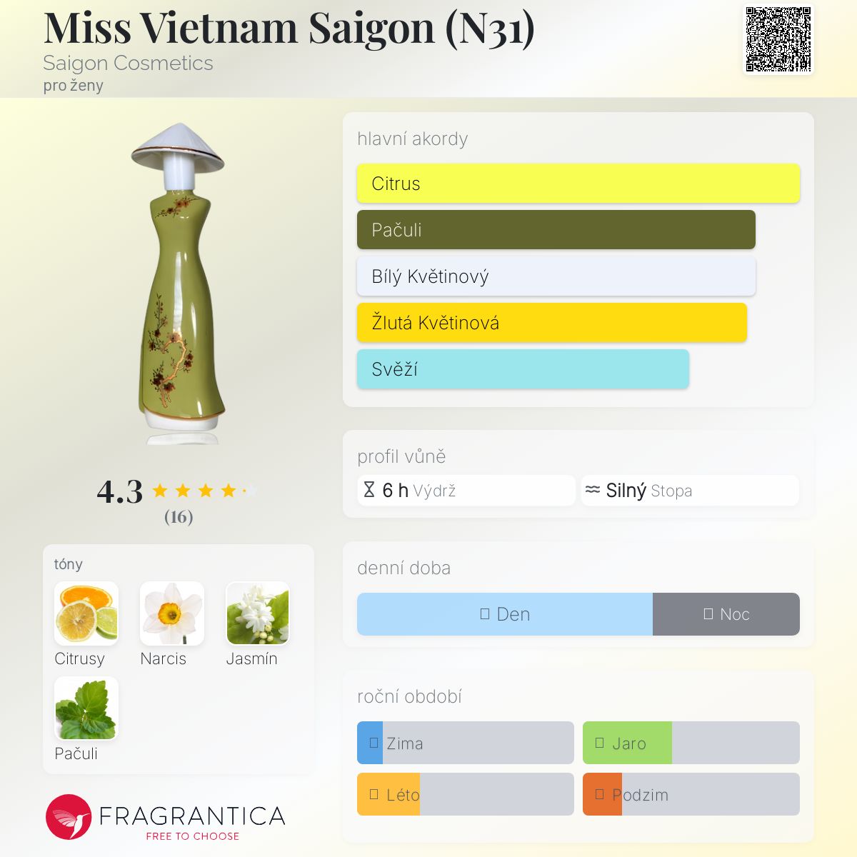 Miss Vietnam Saigon (N31) podle Saigon Cosmetics je Chypre Floral vůně pro ženy. Vrchní tón je Citrusy ; střední tóny jsouNarcis a Jasmín ; základní tón je Pačuli.