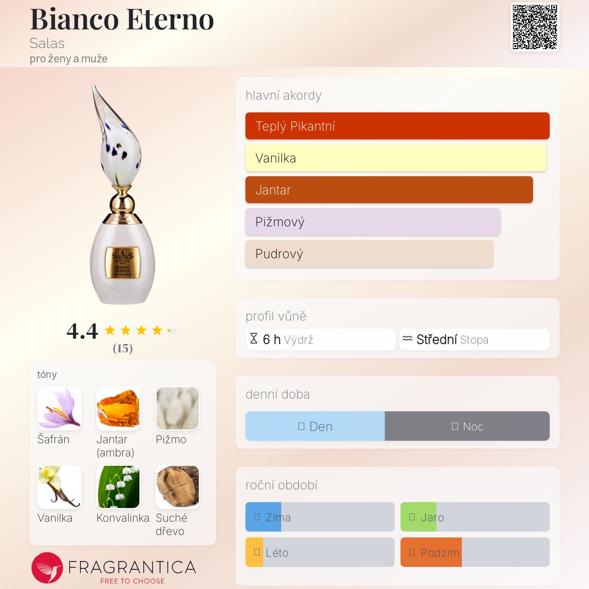 Bianco Eterno podle Salas je vůně pro ženy a muže. Bianco Eterno byl/a uveden/a v roce 2023. "Nosem" za touto vůní je Christian Provenzano. Vrchní tón je Šafrán ; střední tóny jsouKonvalinka a Suché dřevo ; základní tóny jsou Jantar (ambra), Pižmo, Vanilka a Fazole tonka.