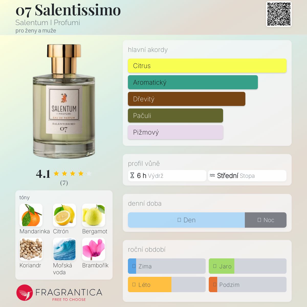 07 Salentissimo podle Salentum I Profumi je vůně pro ženy a muže. Vrchní tóny jsou Mandarinka, Citrón a Bergamot; střední tóny jsouKoriandr, Mořské tóny a Brambořík ; základní tóny jsou Cedr, Pižmo a Pačuli.