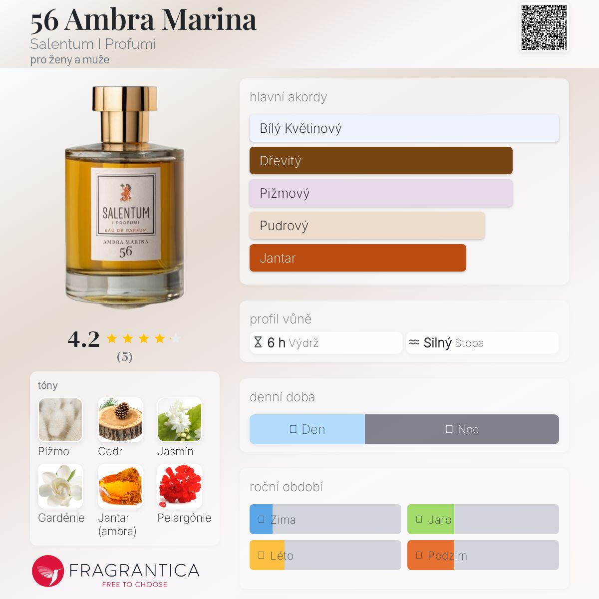 56 Ambra Marina podle Salentum I Profumi je vůně pro ženy a muže. Vrchní tóny jsou Jasmín a Gardénie; střední tóny jsouBílé pižmo a Pelargónie ; základní tóny jsou Cedr a Jantar (ambra).