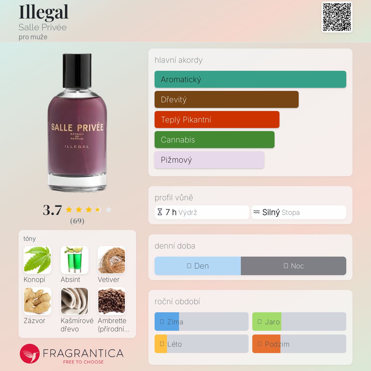 Illegal podle Salle Privée je Woody Aromatic vůně pro muže. Illegal byl/a uveden/a v roce 2021. Vrchní tóny jsou Konopí, Absint, Zázvor a Kardamom; střední tóny jsouKašmírové dřevo, Kůže a Pelargónie ; základní tóny jsou Vetiver, Ambrette (přírodní pižmo) a Guajakové dřevo.