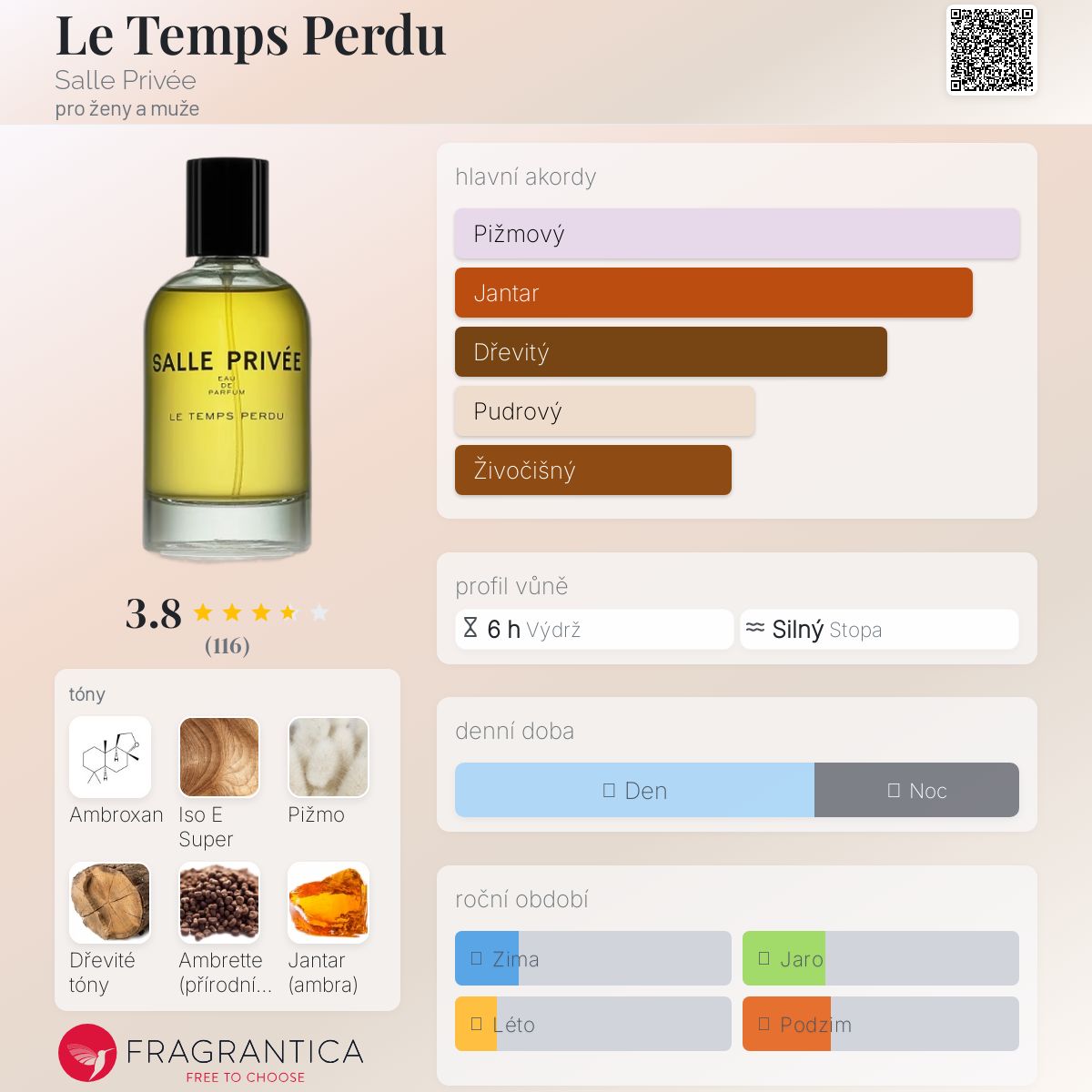 Le Temps Perdu podle Salle Privée je Orientální Woody vůně pro ženy a muže. Le Temps Perdu byl/a uveden/a v roce 2017. "Nosem" za touto vůní je Tanja Deurloo. Vrchní tóny jsou Ambrette (přírodní pižmo) a Jantar (ambra); střední tóny jsouAmbroxan, Iso E Super a Pižmo ; základní tón je Temné dřevité tóny.