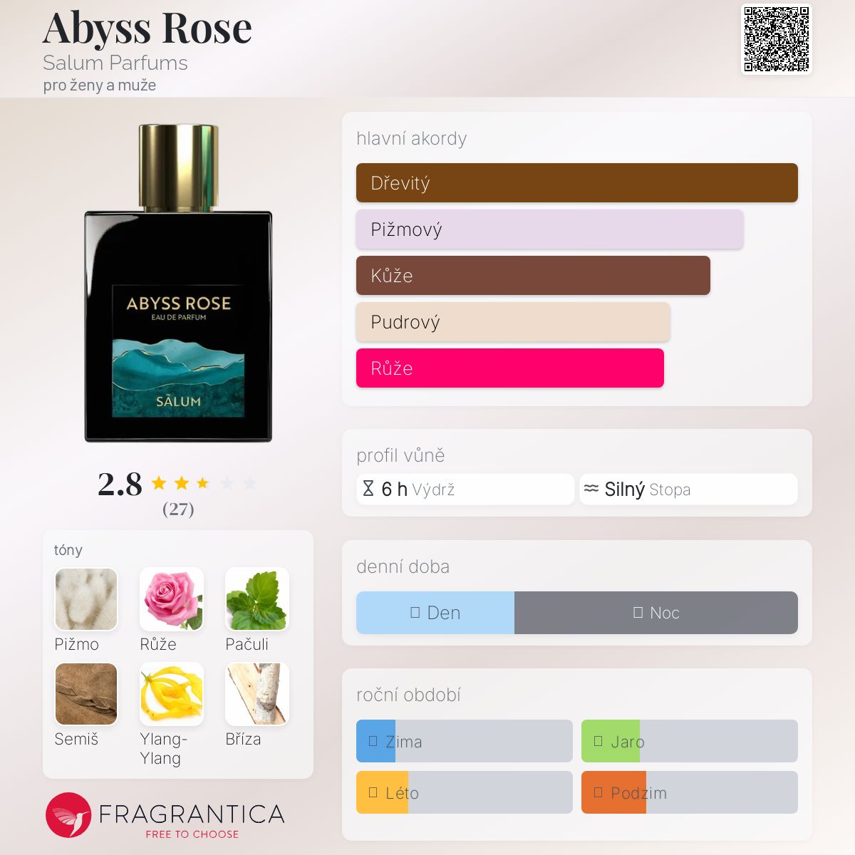 Abyss Rose podle Salum Parfums je vůně pro ženy a muže. Abyss Rose byl/a uveden/a v roce 2023. "Nosem" za touto vůní je Luca Maffei. Vrchní tóny jsou Damašská růže, Ylang-Ylang, Růžový pepř, Bergamot a Mořská sůl; střední tóny jsouPačuli, Guajakové dřevo a Styrax ; základní tóny jsou Pižmo, Semiš, Bříza, Cedr, Vanilka a Jantar (ambra).