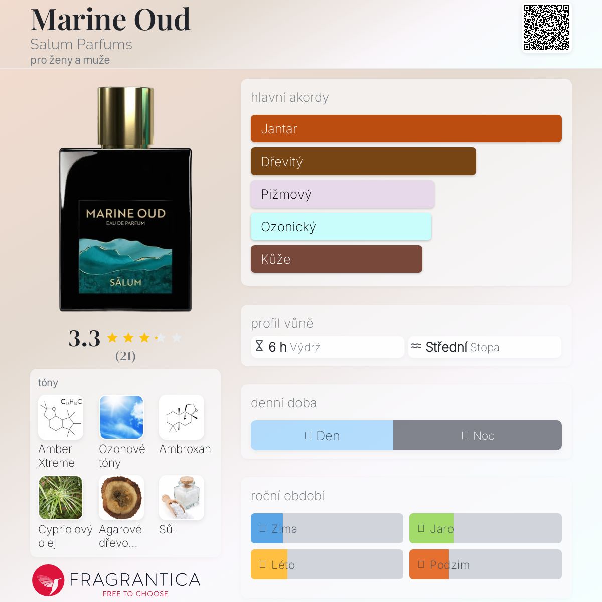 Marine Oud podle Salum Parfums je vůně pro ženy a muže. Marine Oud byl/a uveden/a v roce 2023. "Nosem" za touto vůní je Luca Maffei. Vrchní tóny jsou Ozonové tóny, Mořská sůl, Žlutá mandarinka, Zázvor a Růžový pepř; střední tóny jsouCypriolový olej, Šafrán, Myrha, Kůže, Labdanum, Tabák a Káva ; základní tóny jsou Amber Xtreme, Ambroxan, Agarové dřevo (oud), Iso E Super, Bříza, Styrax a Kadidlo.