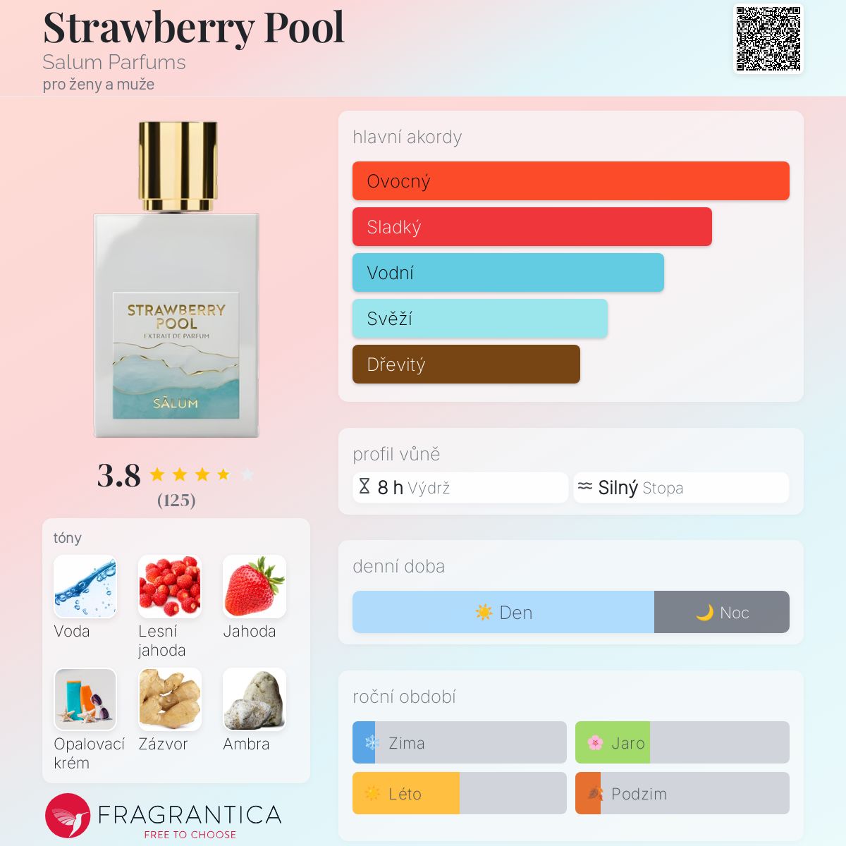 Strawberry Pool podle Salum Parfums je Floral Aquatic vůně pro ženy a muže. Toto je nová vůně. Strawberry Pool byl/a uveden/a v roce 2024. "Nosem" za touto vůní je Sofia Bardelli. Vrchní tóny jsou Lesní jahoda, Jahoda, Zázvor a Růžový pepř; střední tón jeVodní tóny ; základní tóny jsou Opalovací krém, Ambra a Ambrette (přírodní pižmo).