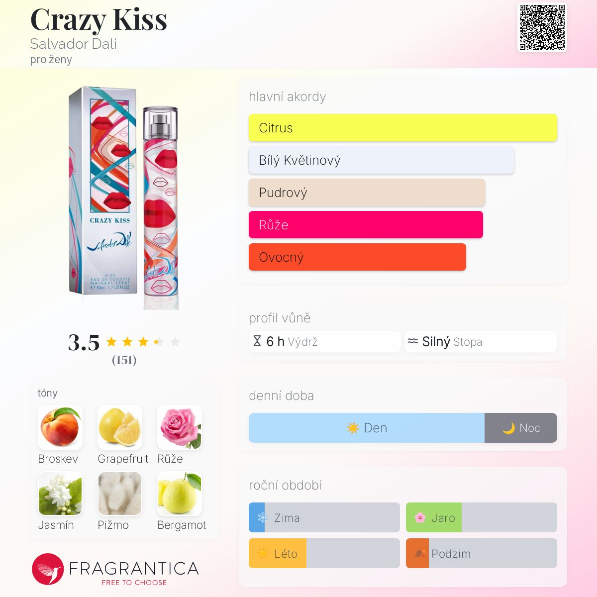 Crazy Kiss podle Salvador Dali je Floral Fruity vůně pro ženy. Crazy Kiss byl/a uveden/a v roce 2012. "Nosem" za touto vůní je Dorothée Piot. Vrchní tóny jsou Broskev, Grapefruit a Bergamot; střední tóny jsouRůže, Jasmín a Konvalinka ; základní tóny jsou Pižmo, Santalové dřevo a Vanilka.