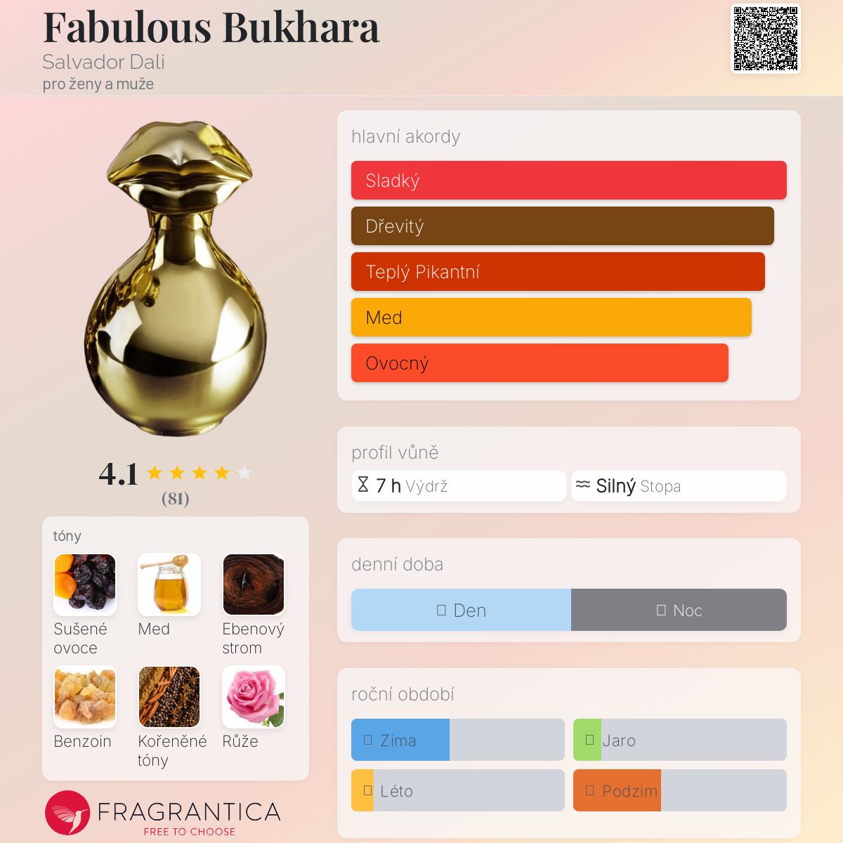 Fabulous Bukhara podle Salvador Dali je Orientální Spicy vůně pro ženy a muže. Fabulous Bukhara byl/a uveden/a v roce 2017. "Nosem" za touto vůní je Raphael Haury. Vrchní tóny jsou Sušené ovoce a Koření; střední tóny jsouMed, Růže a Kapradina ; základní tóny jsou Med, Eben, Benzoin a Fazole tonka.
