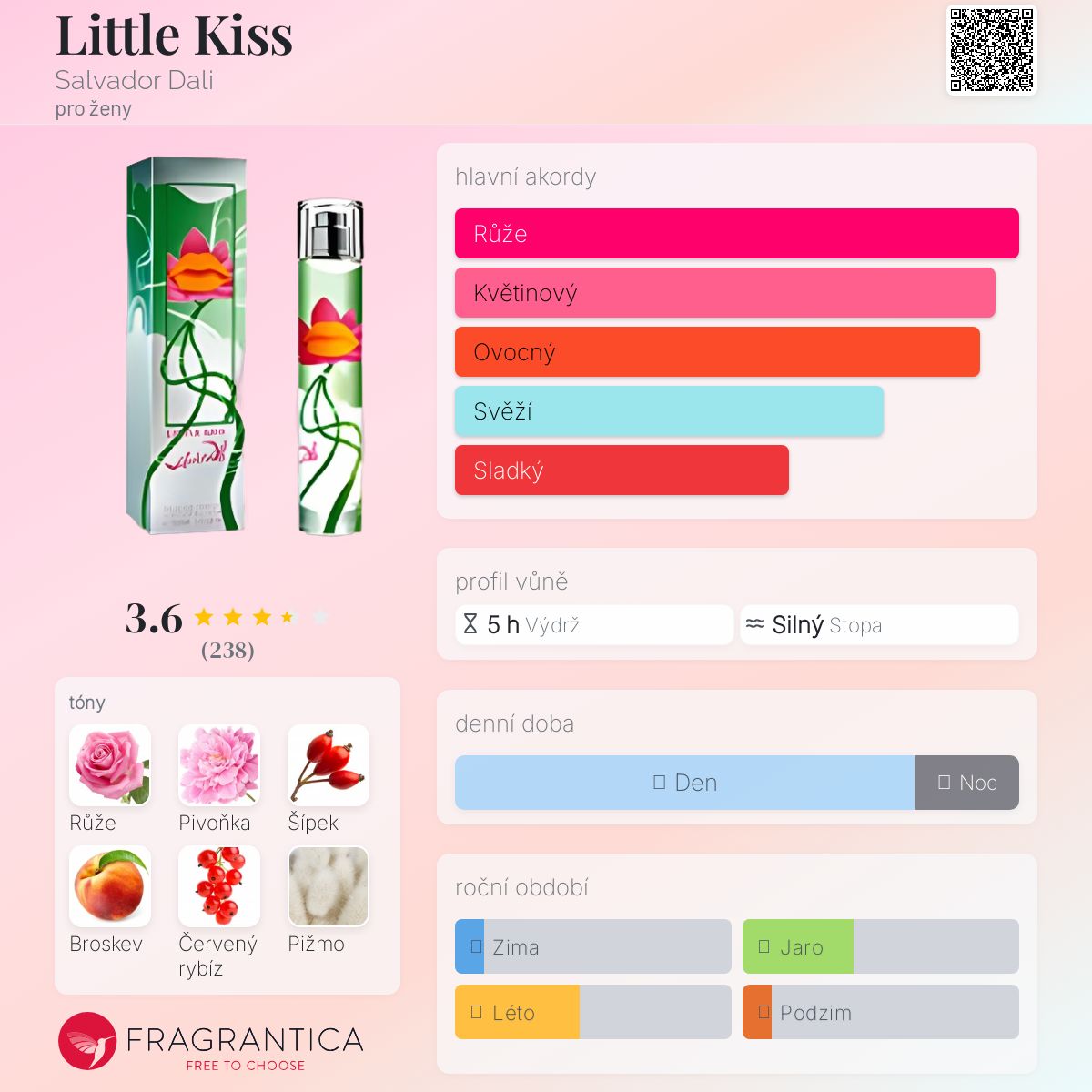 Little Kiss podle Salvador Dali je Floral Fruity vůně pro ženy. Little Kiss byl/a uveden/a v roce 2008. "Nosem" za touto vůní je Guillaume Flavigny. Vrchní tóny jsou Šípek, Červený rybíz, Černý rybíz a Měsíček; střední tóny jsouČajová růže, Pivoňka, Broskev a Brambořík ; základní tóny jsou Pižmo, Santalové dřevo a Pačuli.