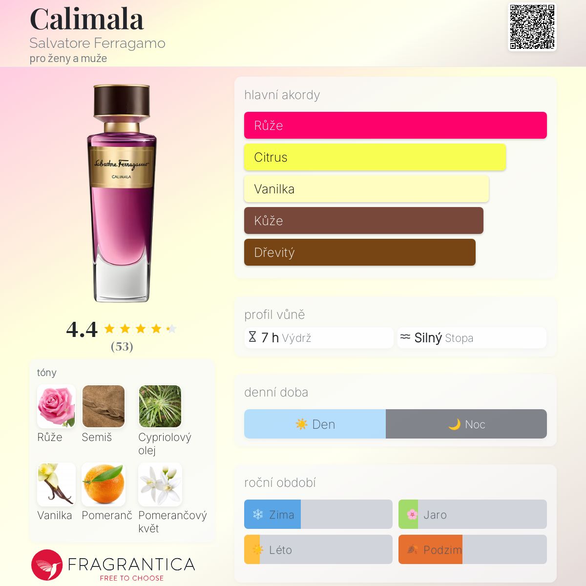 Calimala podle Salvatore Ferragamo je Orientální Spicy vůně pro ženy a muže. Calimala byl/a uveden/a v roce 2018. "Nosem" za touto vůní je Fabrice Pellegrin. Vrchní tóny jsou Růže, Pomeranč a Kardamom; střední tóny jsouDamašská růže, Růže a Pomerančový květ ; základní tóny jsou Semiš, Cypriolový olej a Vanilka.
