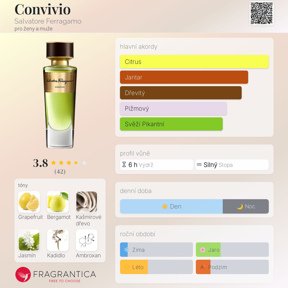 Convivio podle Salvatore Ferragamo je Woody vůně pro ženy a muže. Convivio byl/a uveden/a v roce 2018. "Nosem" za touto vůní je Fabrice Pellegrin. Vrchní tóny jsou Grapefruit, Bergamot a Semena mrkve; střední tóny jsouJasmín, Fialka a Cypřiš ; základní tóny jsou Kašmírové dřevo, Kadidlo a Ambroxan.