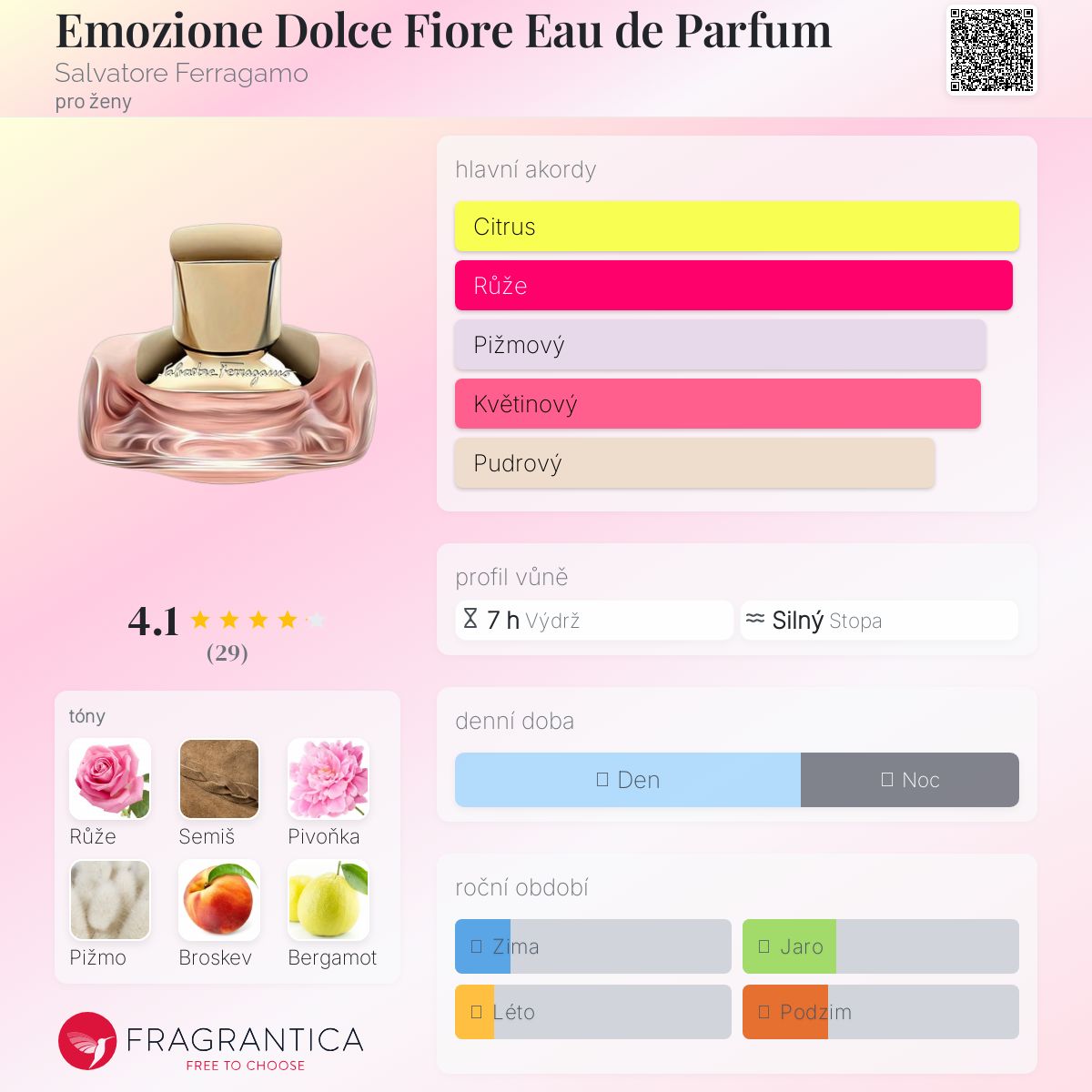 Emozione Dolce Fiore Eau de Parfum podle Salvatore Ferragamo je Floral Fruity vůně pro ženy. Emozione Dolce Fiore Eau de Parfum byl/a uveden/a v roce 2017. Emozione Dolce Fiore Eau de Parfum byl/a vytvořen/a Alberto Morillas a Amandine Clerc-Marie. Vrchní tóny jsou Broskev, Bergamot a Grapefruit; střední tóny jsouRůže a Pivoňka ; základní tóny jsou Semiš, Bílé pižmo a Vanilka.