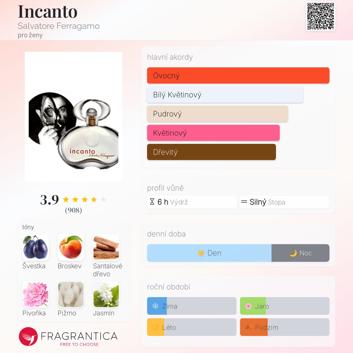 Incanto podle Salvatore Ferragamo je Orientální Woody vůně pro ženy. Incanto byl/a uveden/a v roce 2003. "Nosem" za touto vůní je Laurent Bruyere. Vrchní tóny jsou Švestka a Broskev; střední tóny jsouPivoňka, Jasmín a Červená lilie ; základní tóny jsou Santalové dřevo, Bílé pižmo a Jantar (ambra).