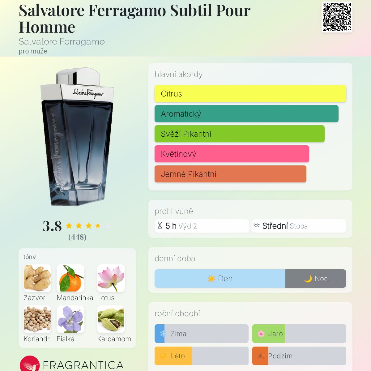 Salvatore Ferragamo Subtil Pour Homme podle Salvatore Ferragamo je Woody Spicy vůně pro muže. Salvatore Ferragamo Subtil Pour Homme byl/a uveden/a v roce 2003. Vrchní tóny jsou Zázvor, Mandarinka, Lotosový list a Kardamom; střední tóny jsouKoriandr, Fialka, Růžový pepř a Pelyněk ; základní tóny jsou Pižmo, Jantar (ambra) a Pačuli.