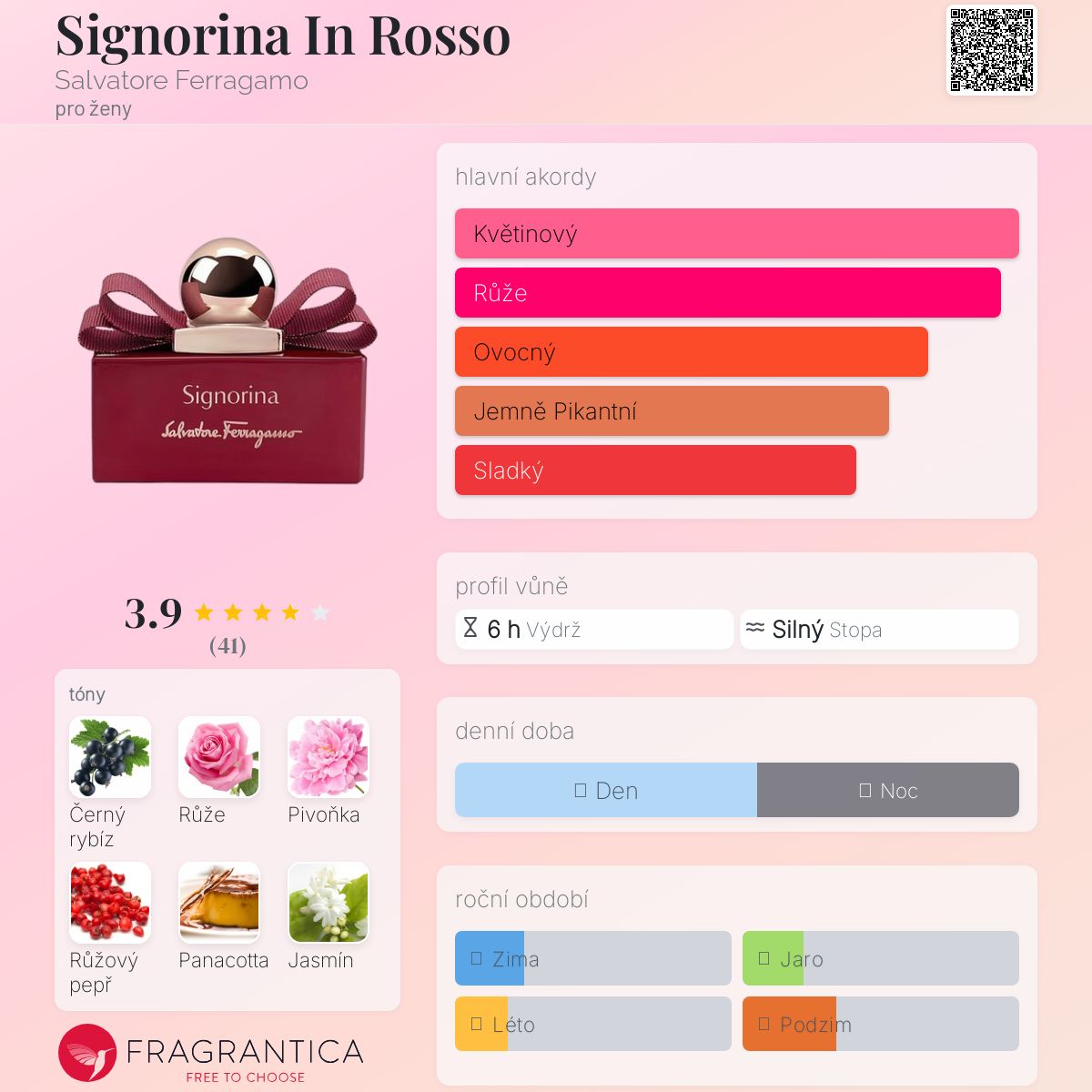 Signorina In Rosso podle Salvatore Ferragamo je Floral vůně pro ženy. Signorina In Rosso byl/a uveden/a v roce 2016. Signorina In Rosso byl/a vytvořen/a Sophie Labbe a Juliette Karagueuzoglou. Vrchní tóny jsou Černý rybíz a Růžový pepř; střední tóny jsouRůže, Pivoňka a Jasmín ; základní tóny jsou Panacotta, Pačuli a Pižmo.