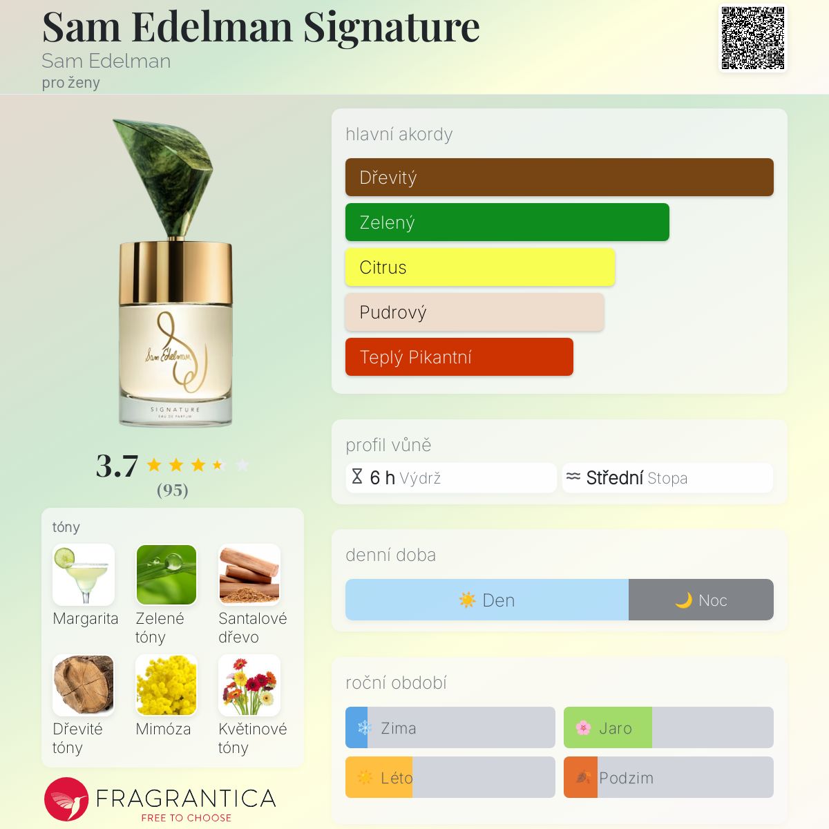 Sam Edelman Signature podle Sam Edelman je Floral vůně pro ženy. Sam Edelman Signature byl/a uveden/a v roce 2021. Vrchní tóny jsou Mimóza a Květinové tóny; střední tóny jsouMargarita, Zelené tóny a Květinové tóny ; základní tóny jsou Santalové dřevo a Dřevité tóny.