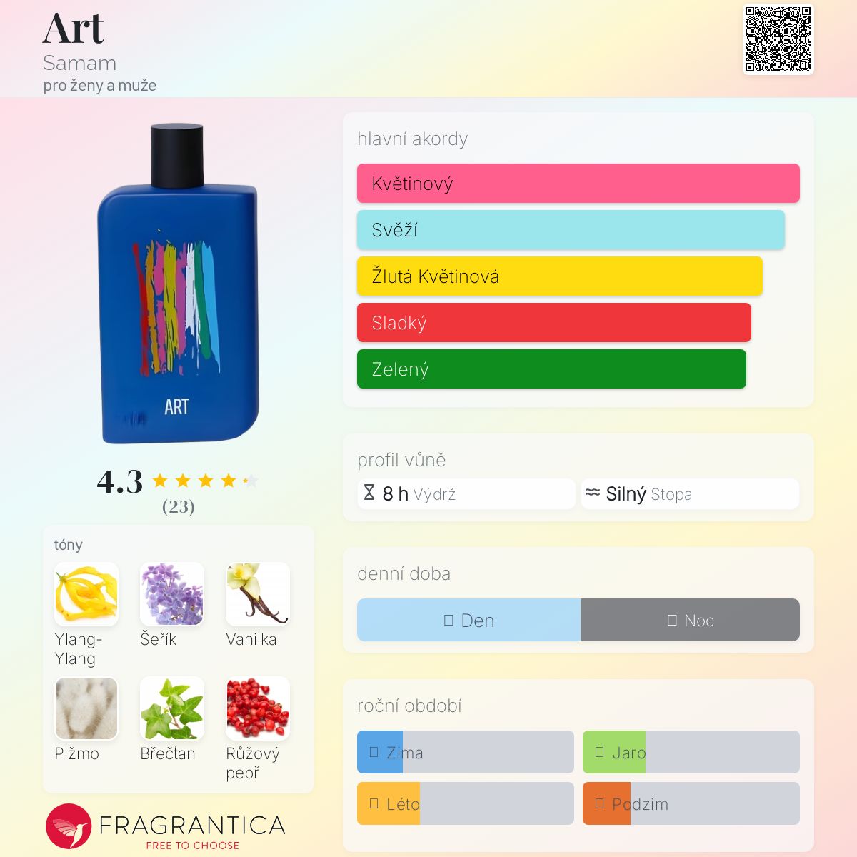 Art podle Samam je Floral Woody Musk vůně pro ženy a muže. Toto je nová vůně. Art byl/a uveden/a v roce 2024. Vrchní tóny jsou Břečťan a Růžový pepř; střední tóny jsouYlang-Ylang, Šeřík a Konvalinka ; základní tóny jsou Vanilka, Bílé pižmo a Santalové dřevo.