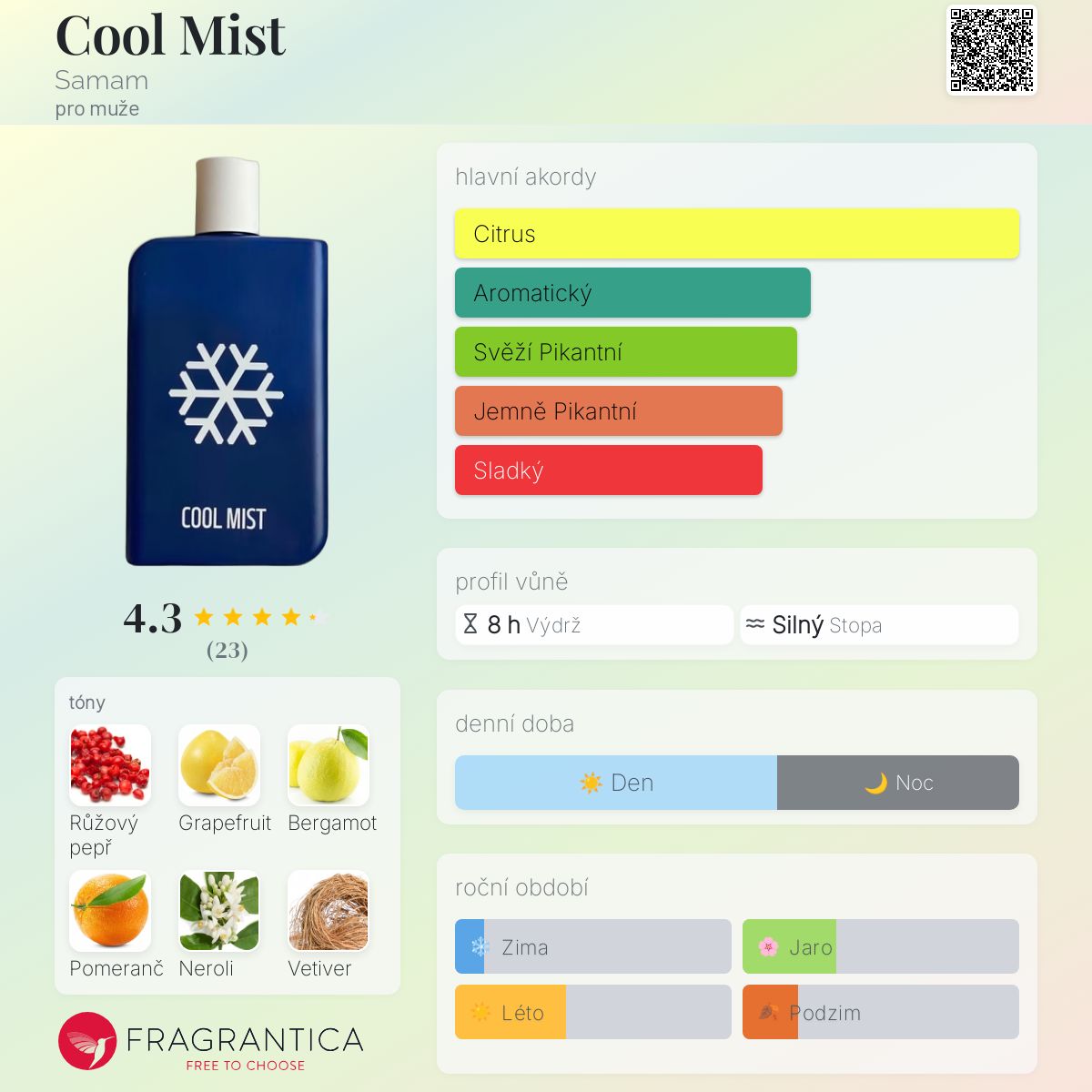 Cool Mist podle Samam je Woody Aromatic vůně pro muže. Toto je nová vůně. Cool Mist byl/a uveden/a v roce 2024. Vrchní tóny jsou Růžový pepř, Grapefruit, Bergamot a Pomeranč; střední tóny jsouNeroli a Mandle ; základní tóny jsou Vetiver a Bílé pižmo.