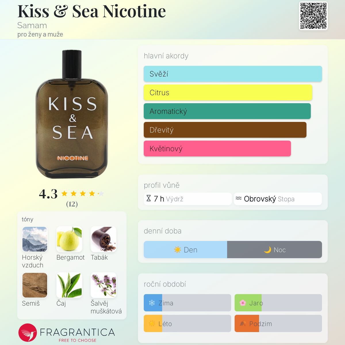Kiss & Sea Nicotine podle Samam je Woody Aromatic vůně pro ženy a muže. Toto je nová vůně. Kiss & Sea Nicotine byl/a uveden/a v roce 2025. Vrchní tóny jsou Horský vzduch, Bergamot, Šalvěj muškátová, Pomerančový olej, Kardamom a Jalovec; střední tóny jsouČaj, Magnólie, Hedione, Fialka a Růže ; základní tóny jsou Tabák, Semiš, Iso E Super, Santalové dřevo, Fazole tonka, Ambra a Mech.