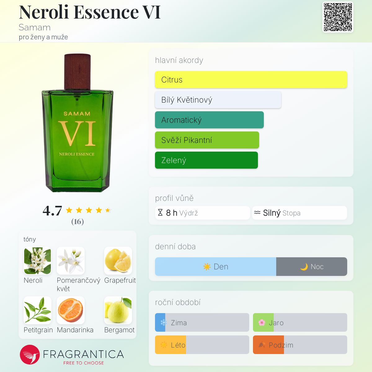 Neroli Essence VI podle Samam je Citrus Aromatic vůně pro ženy a muže. Toto je nová vůně. Neroli Essence VI byl/a uveden/a v roce 2025. Vrchní tóny jsou Grapefruit, Petitgrain, Mandarinka, Bergamot a Citrón; střední tóny jsouNeroli, Pomerančový květ, Zemité tóny, Kouř a Čaj ; základní tóny jsou Ambrette (přírodní pižmo), Ambrette (přírodní pižmo), Vanilka, Myrha, Benzoin a Dubový mech.