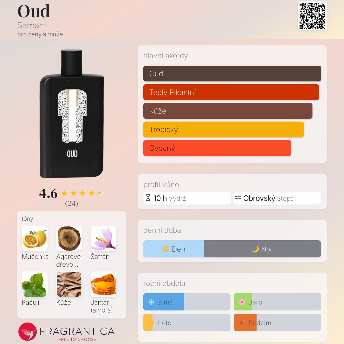 Oud podle Samam je Leather vůně pro ženy a muže. Toto je nová vůně. Oud byl/a uveden/a v roce 2024. Vrchní tóny jsou Agarové dřevo (oud), Šafrán a Mučenka; střední tóny jsouAgarové dřevo (oud) a Pačuli ; základní tóny jsou Jantar (ambra), Kůže a Vanilka.