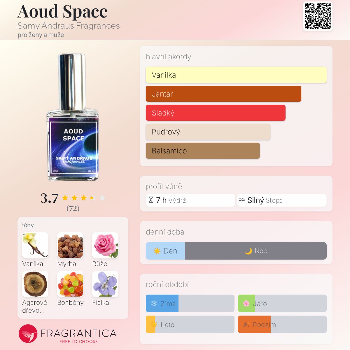 Aoud Space podle Samy Andraus Fragrances je vůně pro ženy a muže. Aoud Space byl/a uveden/a v roce 2020. Vrchní tóny jsou Růže a Agarové dřevo (oud); střední tóny jsouVanilka, Sladké tóny a Jantar (ambra) ; základní tóny jsou Myrha a Fialka.