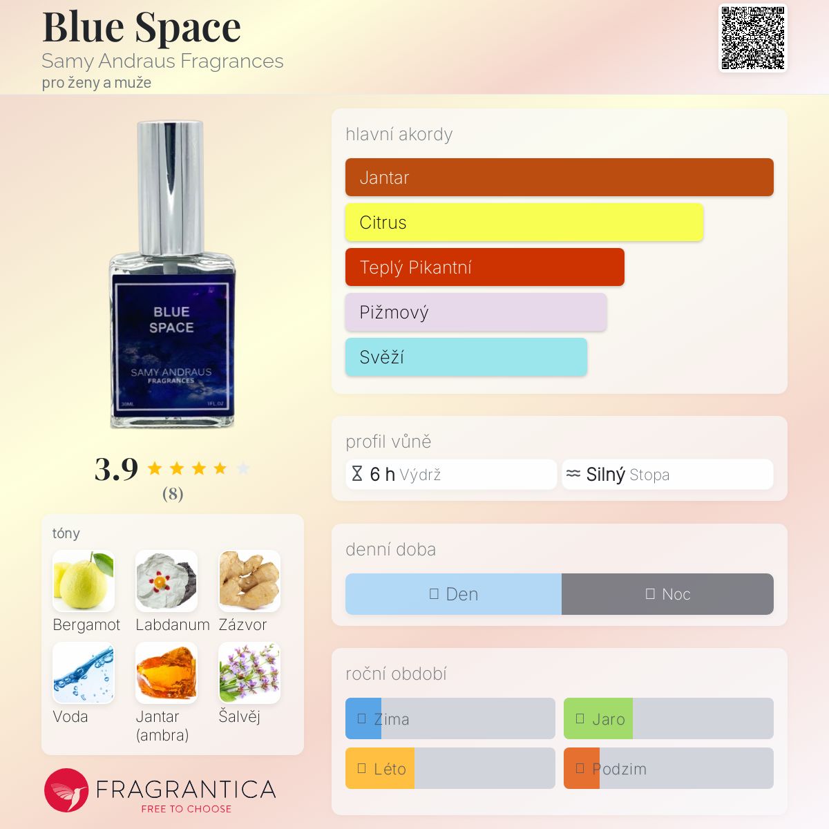 Blue Space podle Samy Andraus Fragrances je Aromatic vůně pro ženy a muže. Blue Space byl/a uveden/a v roce 2021. Vrchní tóny jsou Bergamot, Zázvor a Grapefruit; střední tóny jsouVodní tóny, Šalvěj, Rozmarýn a Pelargónie ; základní tóny jsou Labdanum, Jantar (ambra) a Ambroxan.